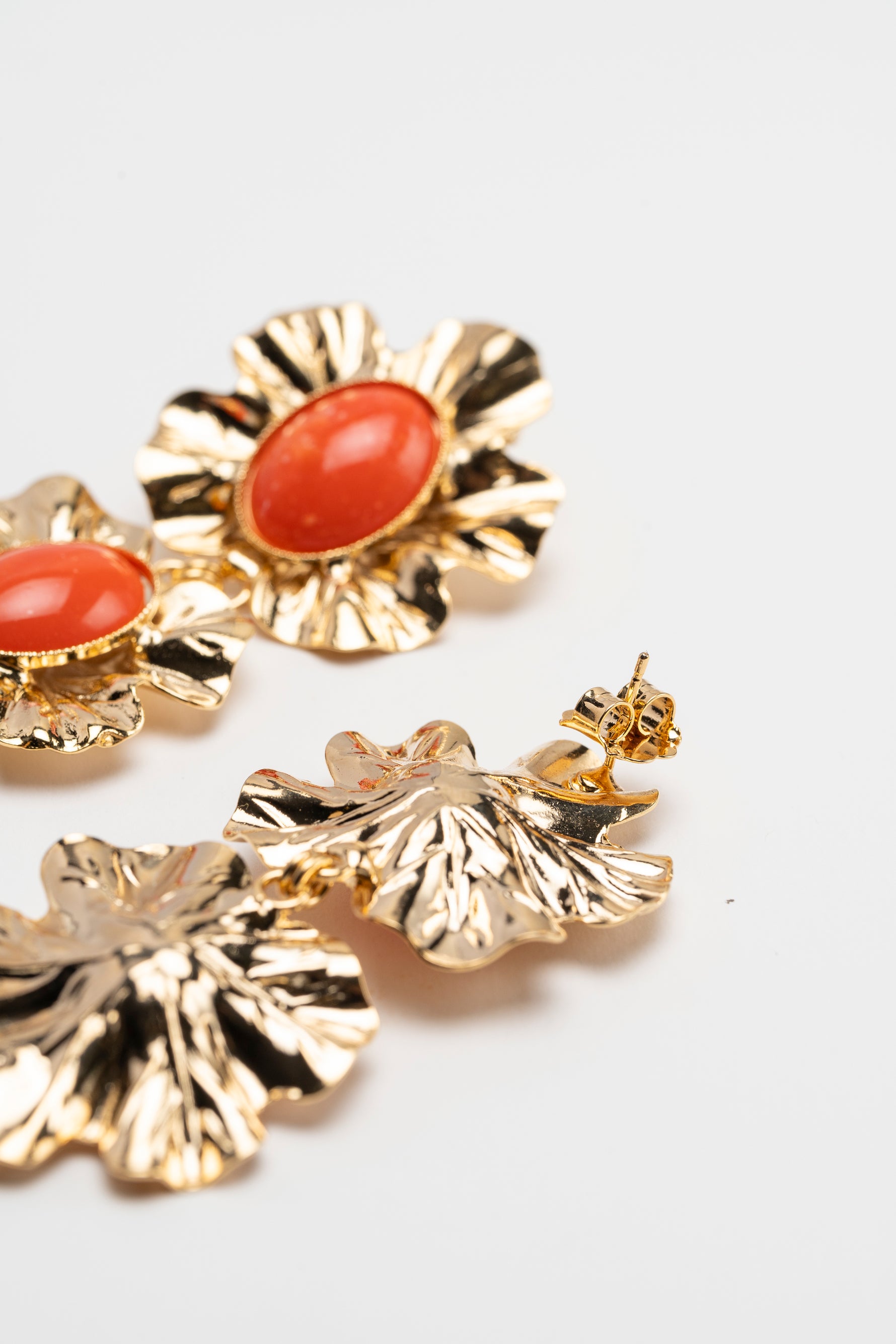 Orecchini Passione Fiorita con Metallo Floreale e Ovale Cabochon Corallo