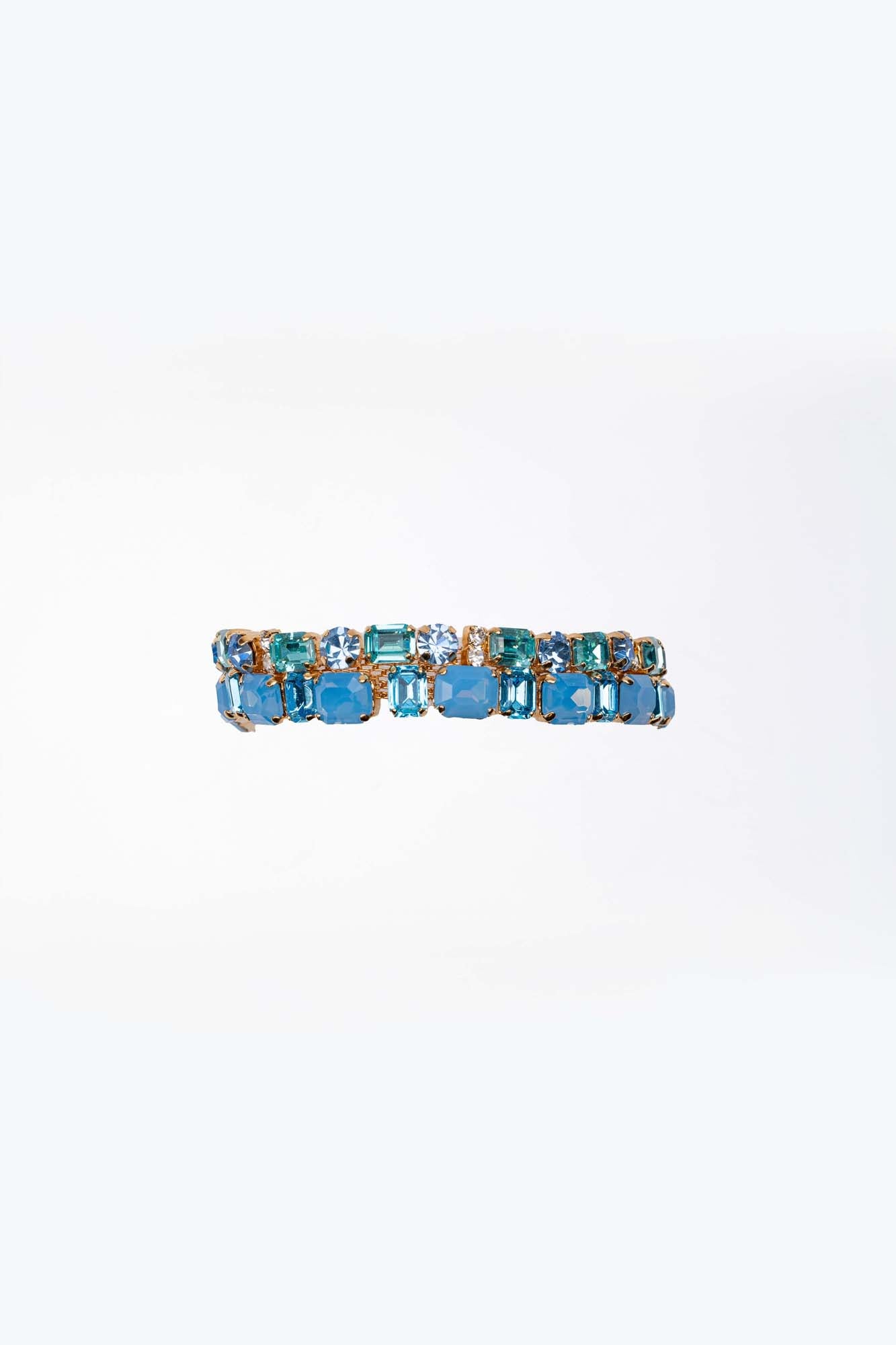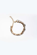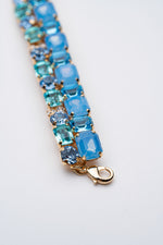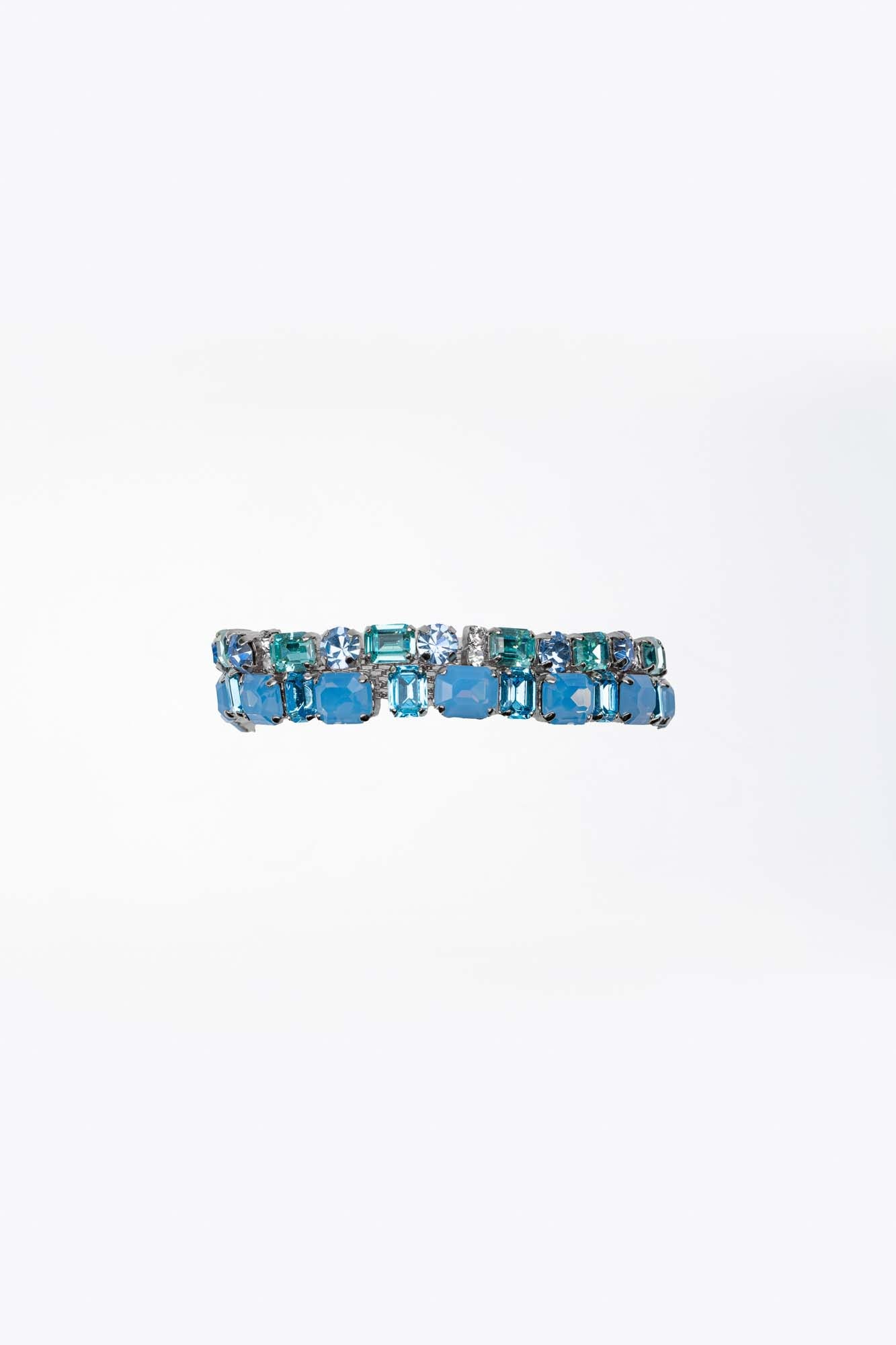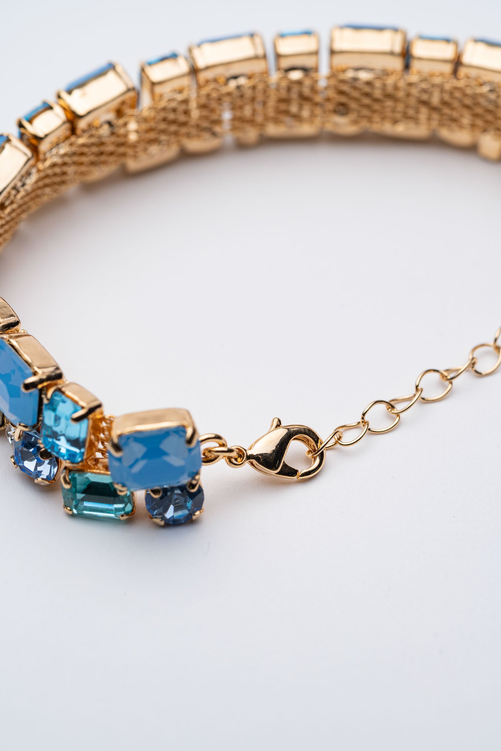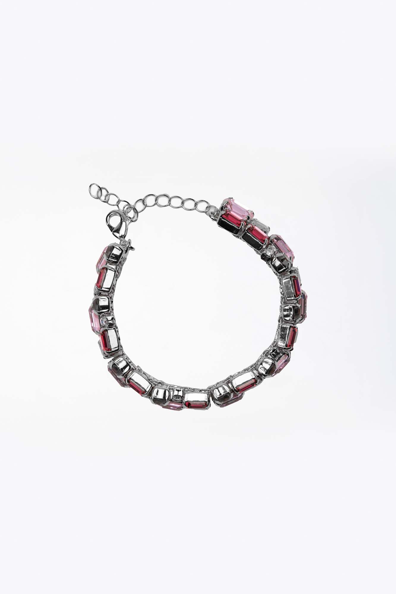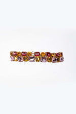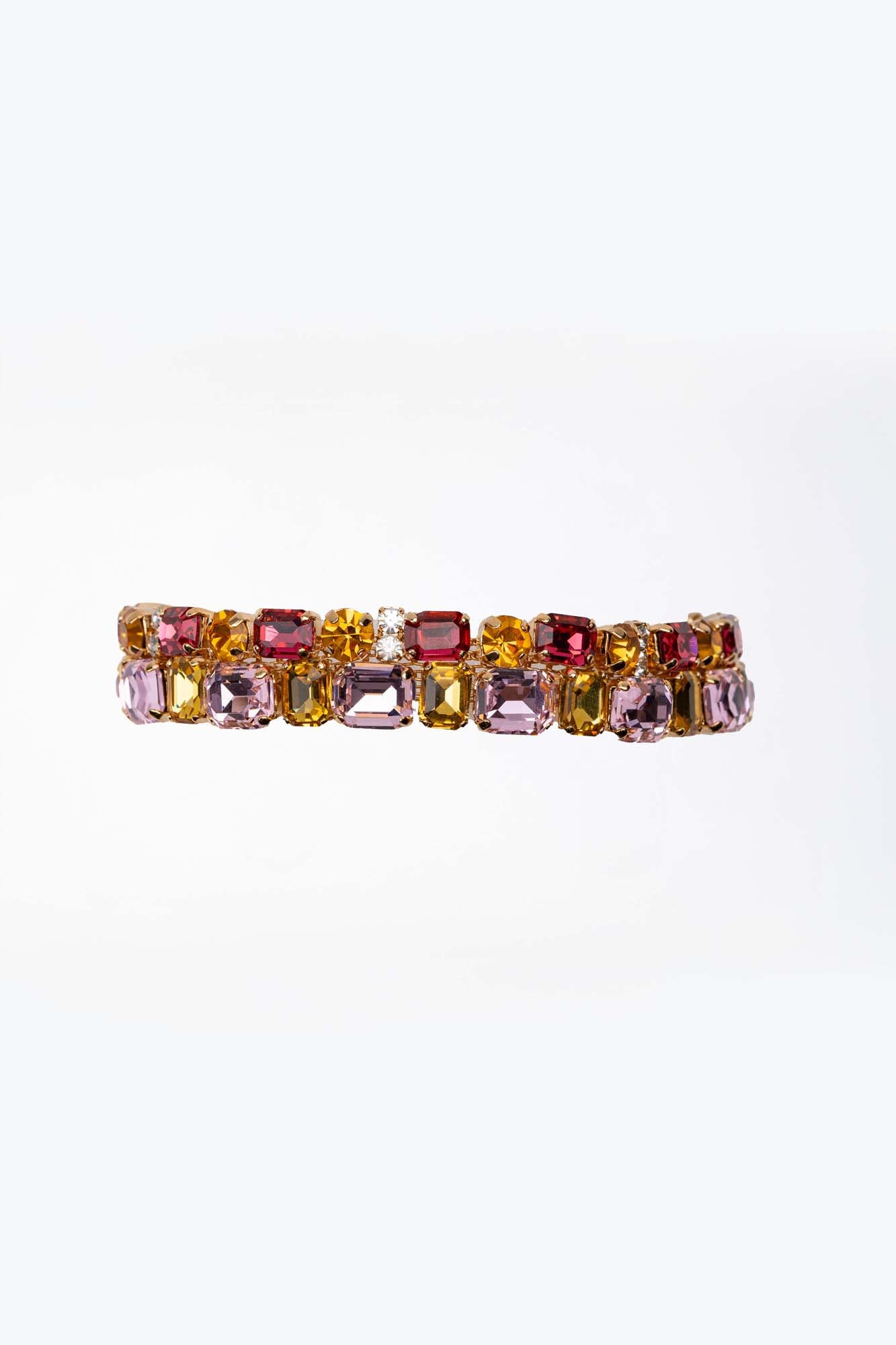 “Arcobaleno Imperfetto” è un bracciale che gioca con le sfumature, combinando con maestria cristalli dalle tonalità fucsia, ametista, giallo miele e champagne. I tagli rettangolari e rotondi si alternano creando una composizione geometrica e vibrante, come una scacchiera di luce in movimento.