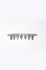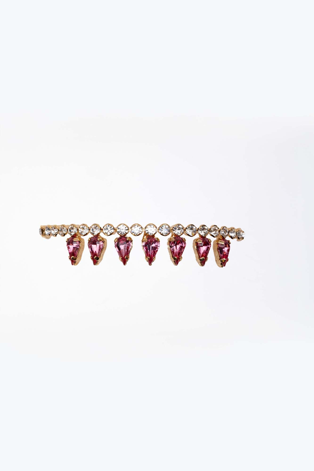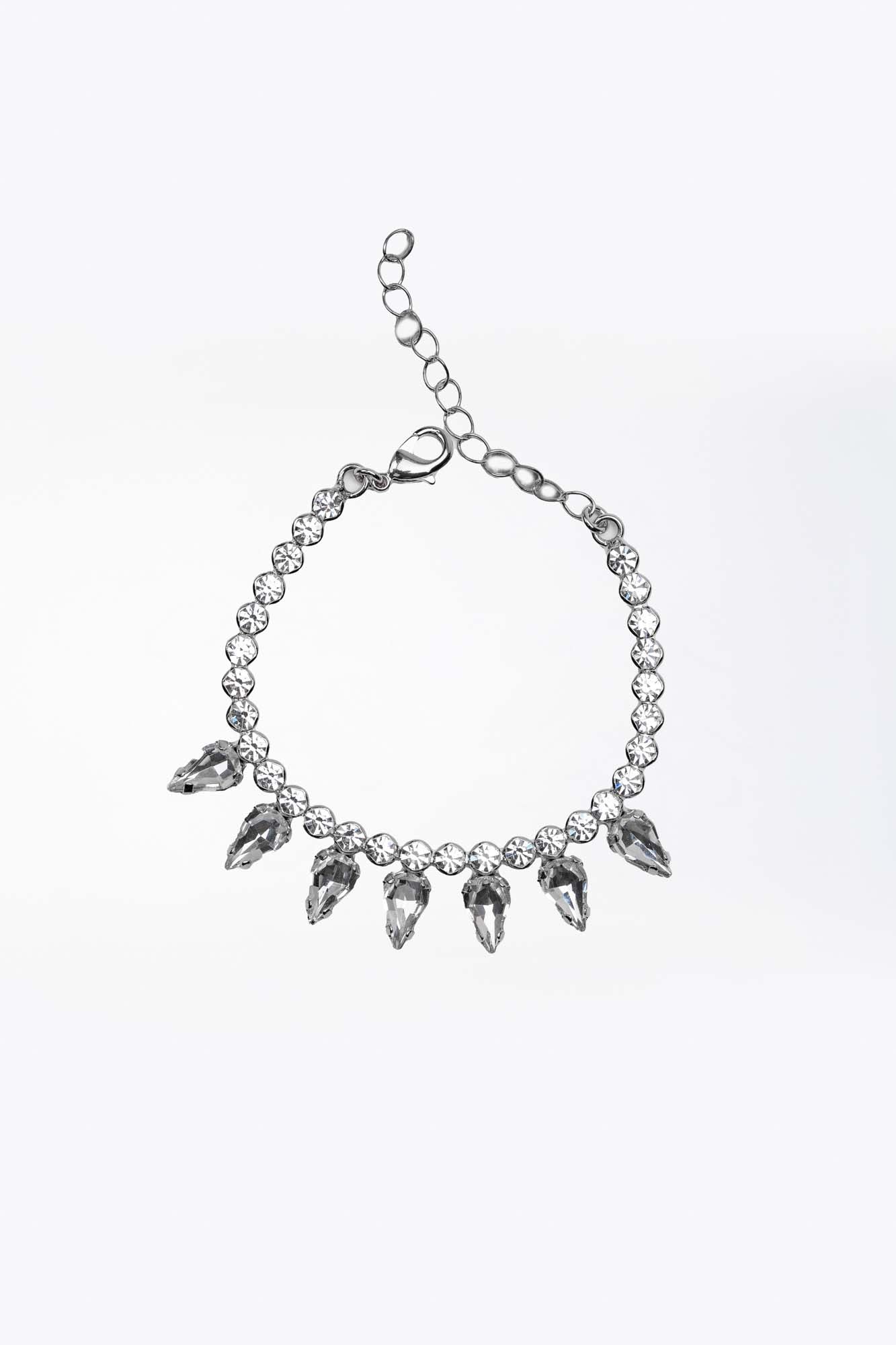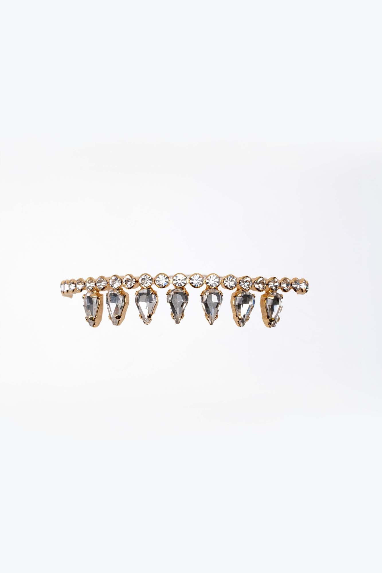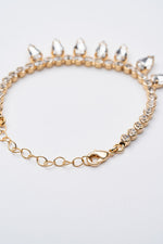 “Gocce di cielo” è un bracciale che racconta la bellezza dell’essenziale. Una fila di cristalli color cristallo, incastonati su una base dorata, si fonde armoniosamente con pendenti trasparenti dalla forma di goccia. Ogni elemento riflette la luce con grazia, come piccole scintille sospese nell’aria.