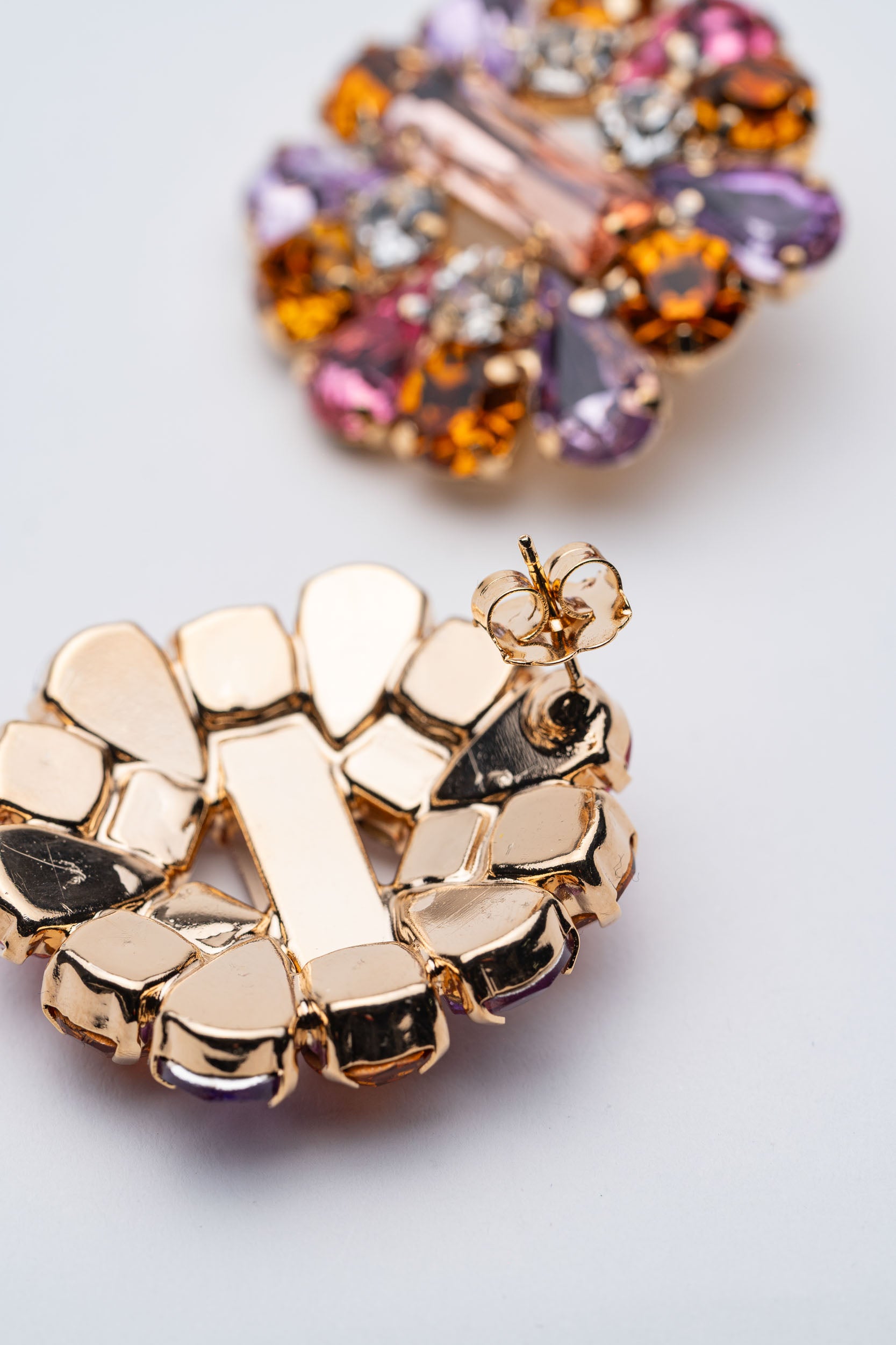 - Materiale: Metallo placcato oro, cristalli arancioni, viola e trasparenti.