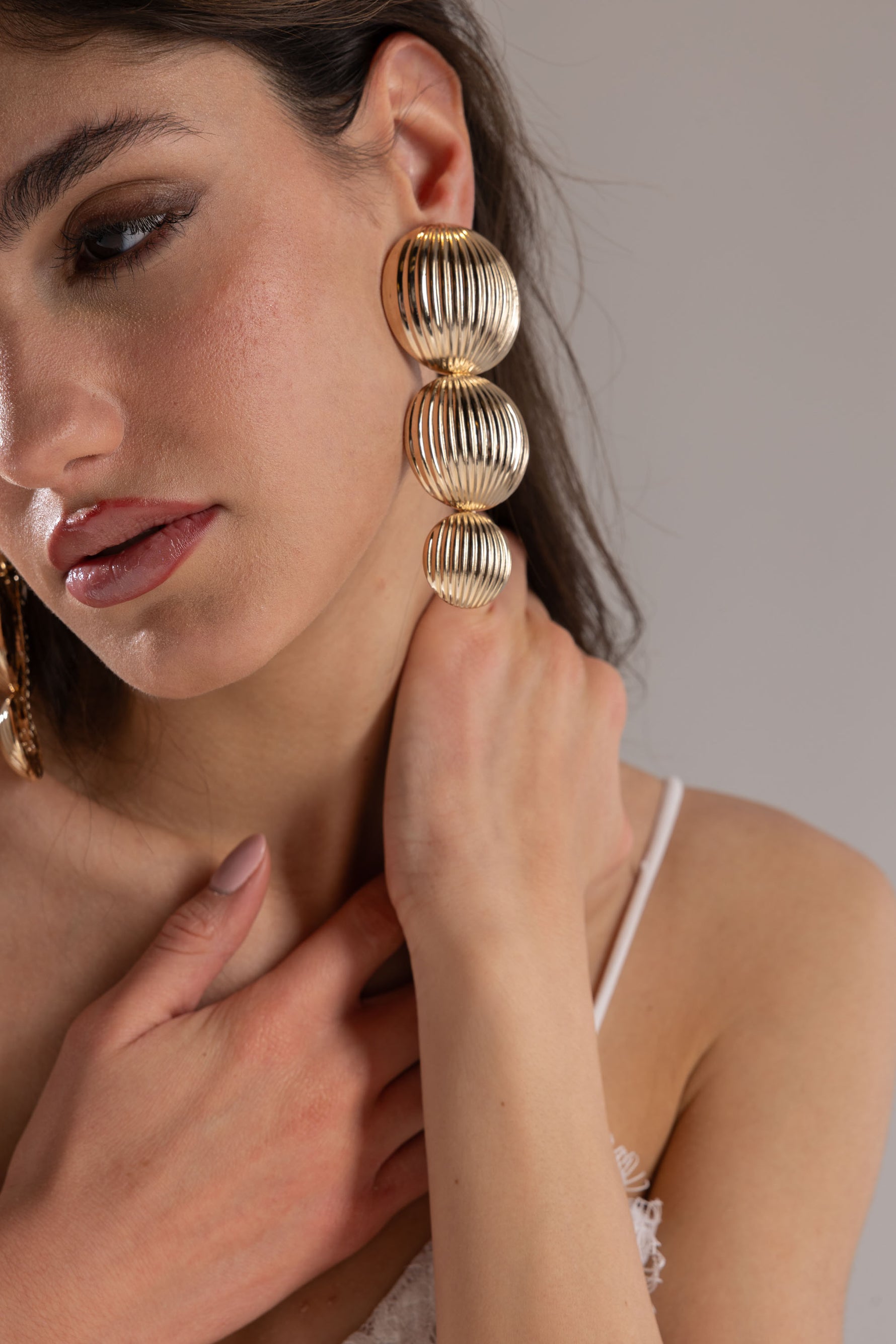 Orecchini pendenti composti da tre sfere scanalate di dimensioni decrescenti, realizzati in ottone anallergico free nickel. Un design sofisticato e strutturato che gioca con volumi e texture per un effetto scenografico.