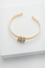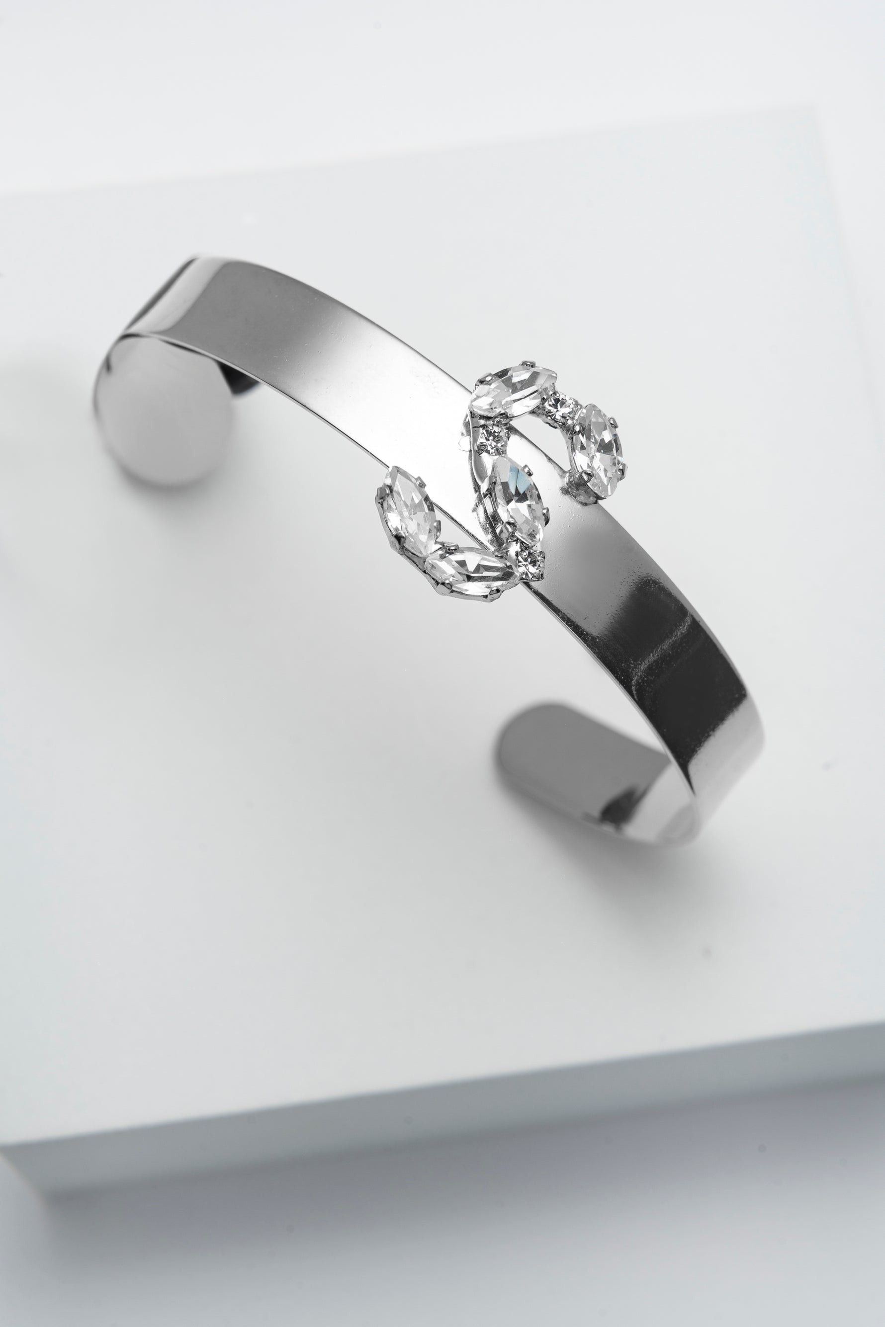 La sua struttura rigida regolabile, dal finish dorato specchiato, abbraccia il polso con luminosità, mentre il dettaglio di cristalli taglio marquise aggiunge un punto luce prezioso e ricercato.