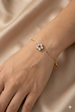 Bracciale dorato con fiore di cristalli bianchi e punto luce rosso centrale. Un tocco delicato e luminoso, simbolo di eleganza e femminilità.