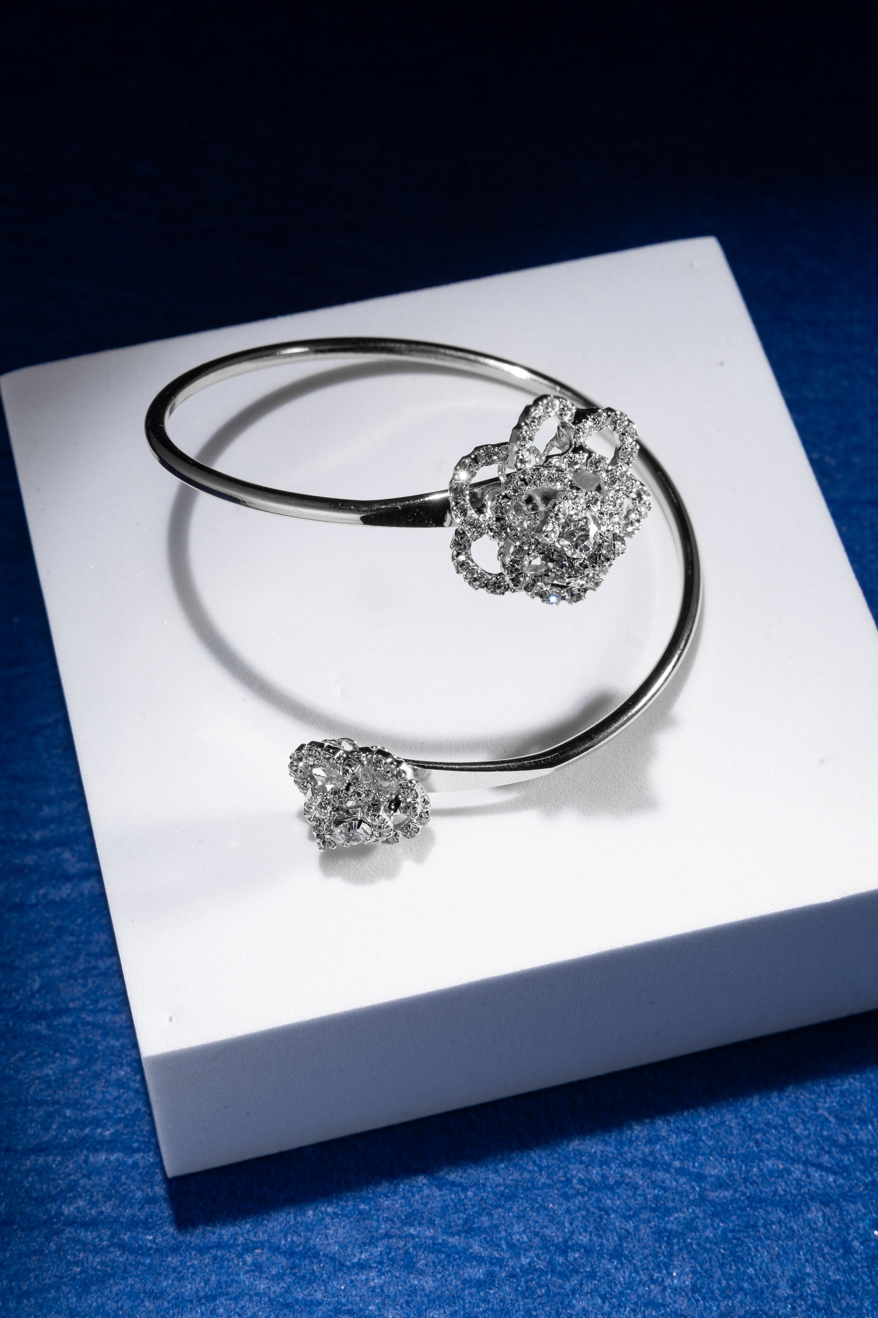La struttura aperta valorizza il polso con leggerezza, mentre le due rose illuminate da cristalli creano un gioco di luce sofisticato e femminile.