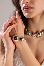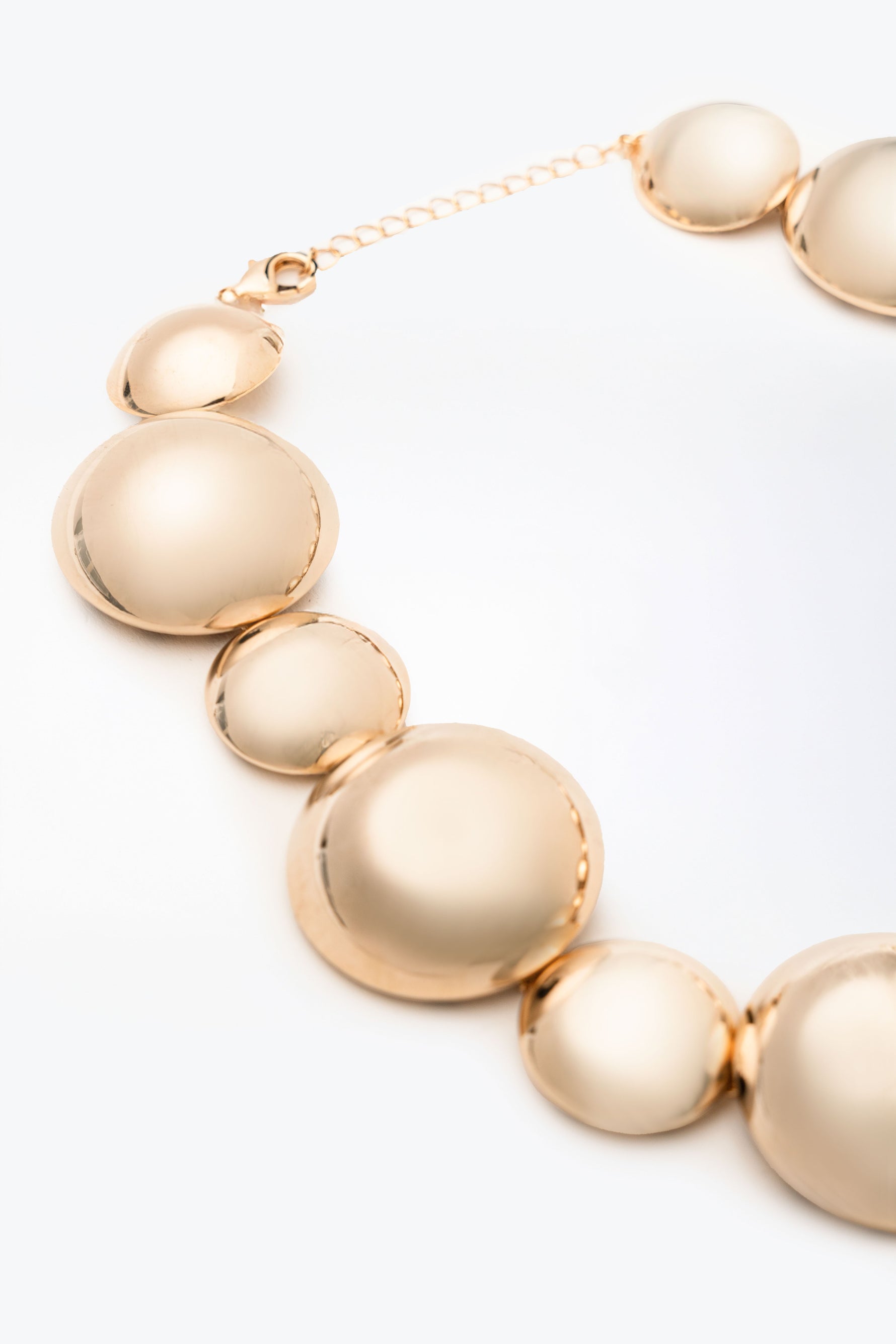 Collana elegante con sfere di metallo dorato di grandezze differenti, dal design sofisticato che unisce luce e modernità in un unico accessorio.