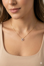 Collana dorata con piccolo ciondolo a fiore composto da zirconi bianchi e un brillante punto luce rosso al centro, simbolo di eleganza e femminilità.