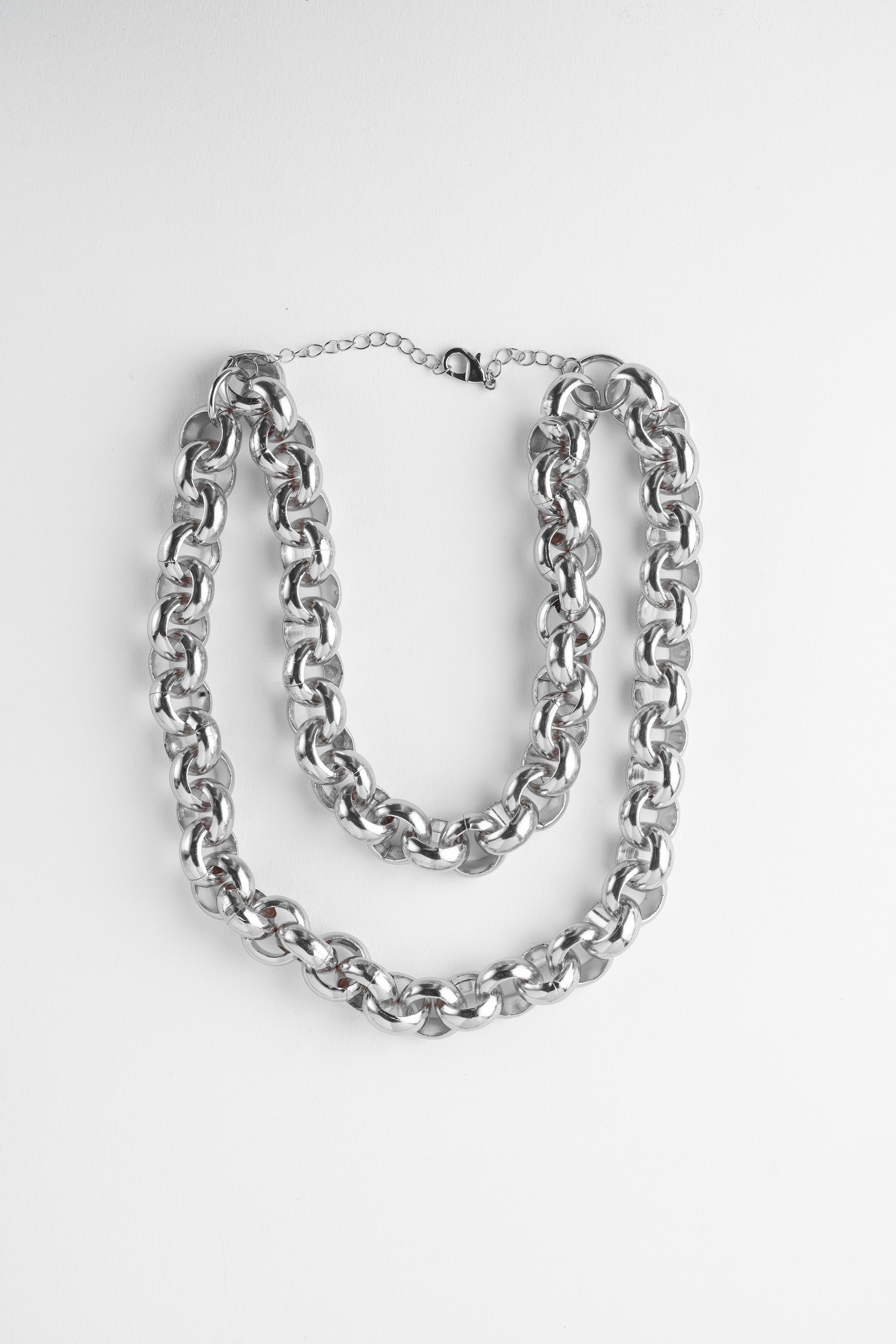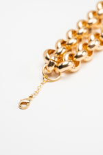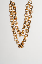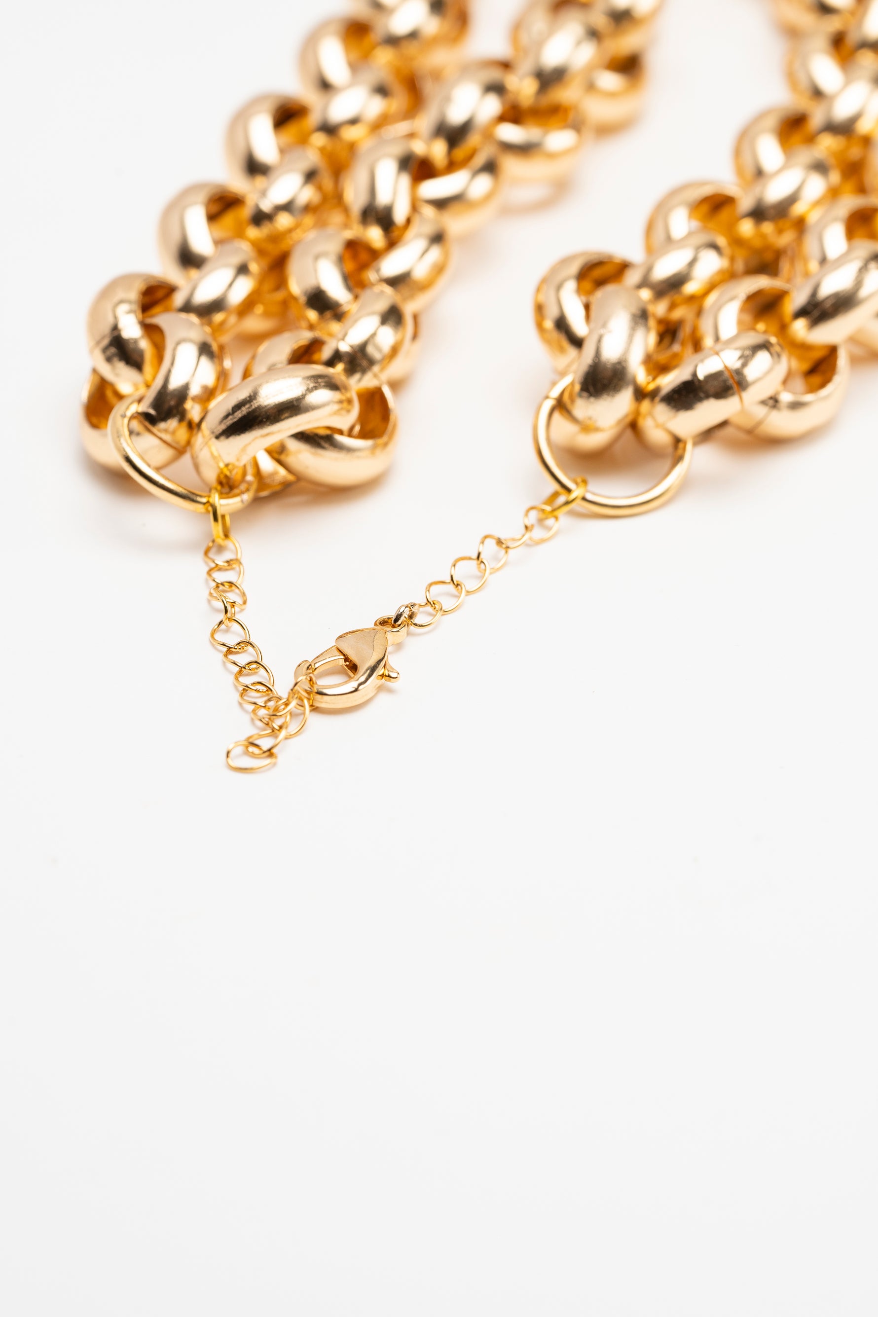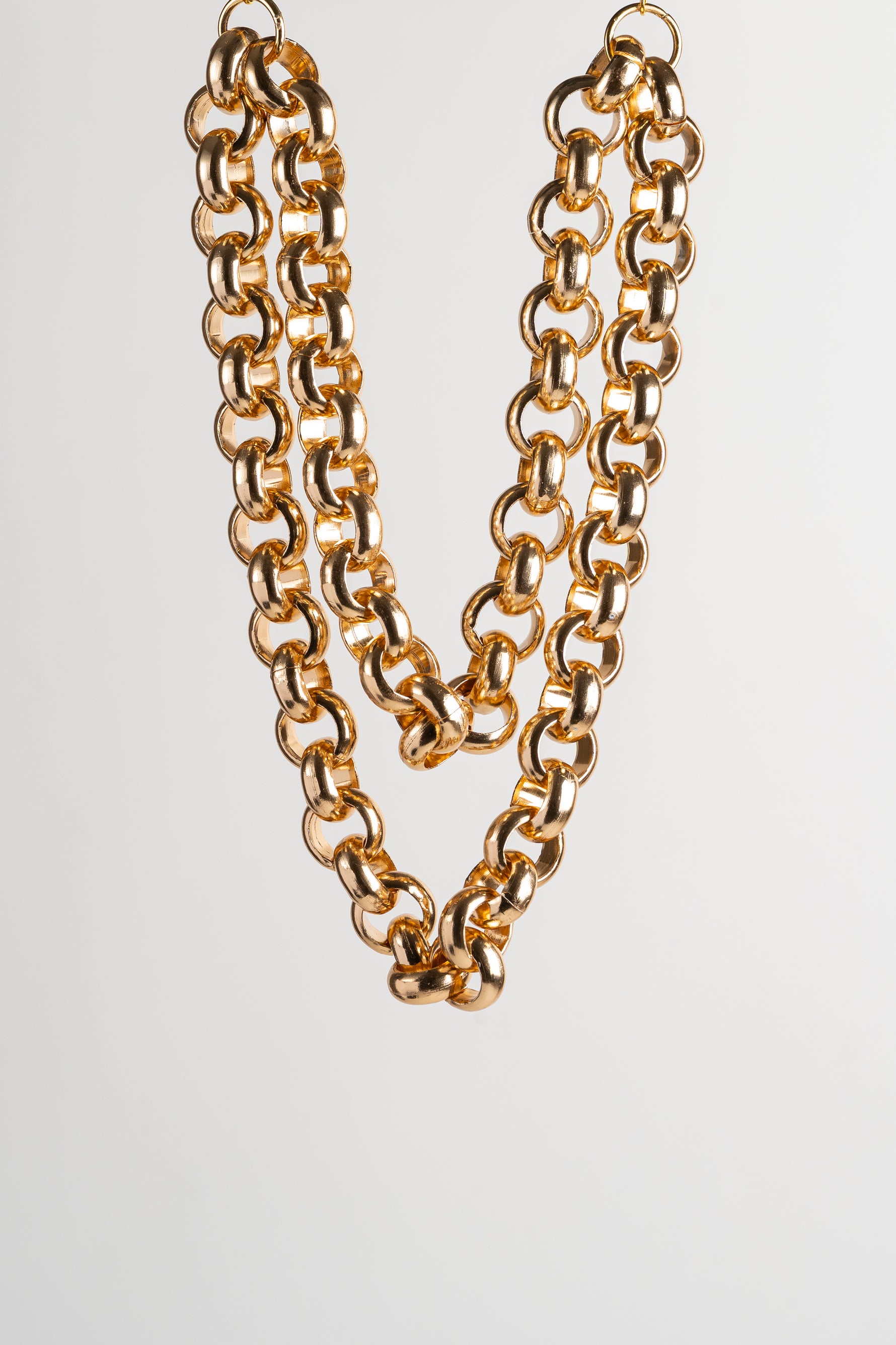 Collana a doppio giro con maglia rotonda oversize in finitura dorata. Un accessorio scenografico che incarna l’energia solare dell’estate e la fluidità delle forme marine.