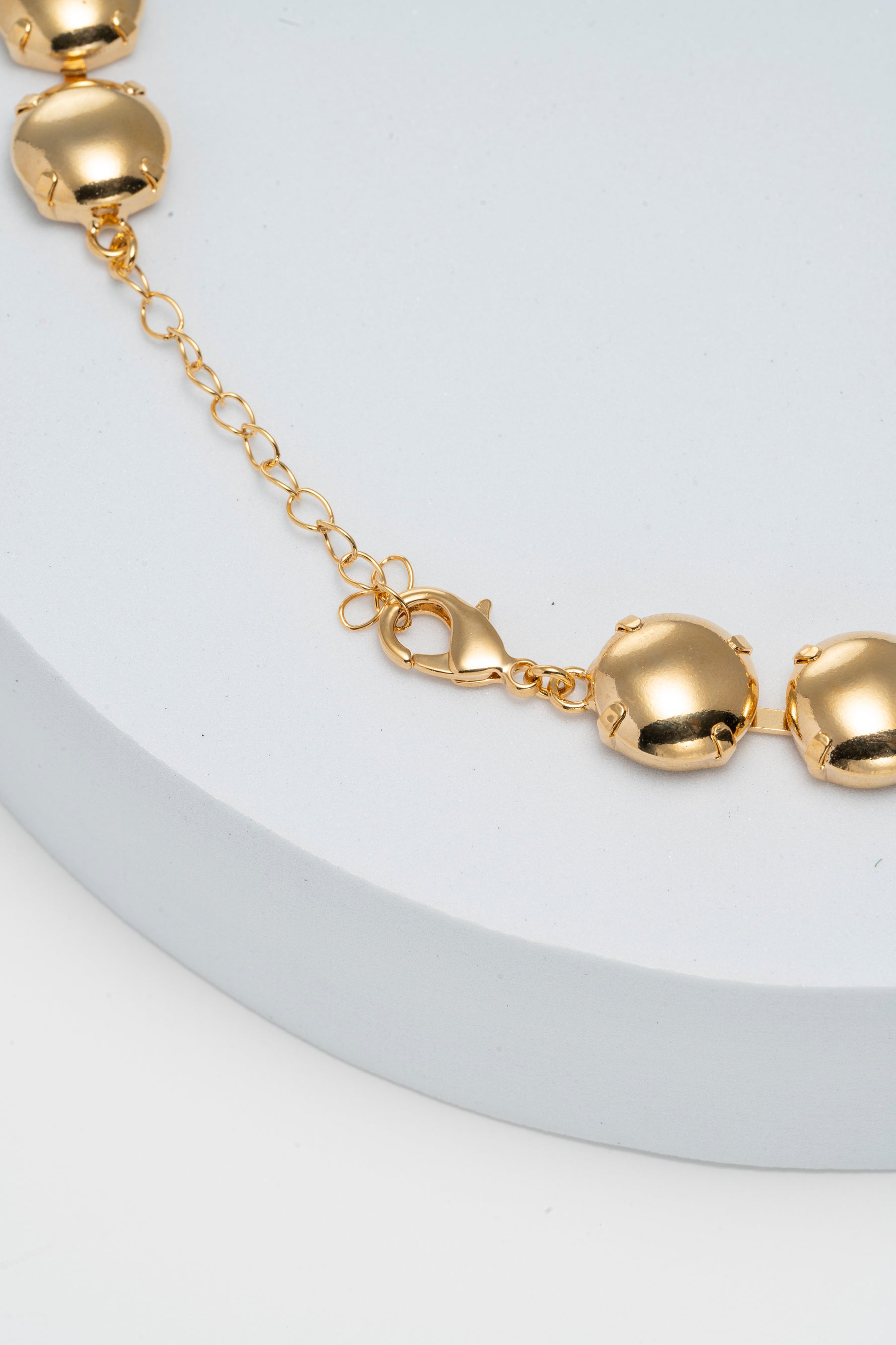 Un tocco regale e contemporaneo in un’unica creazione. Questa collana è composta da una sequenza di maglie dorate lucide e impreziosita da pendenti geometrici in cristallo verde, tagliati con precisione per riflettere la luce con eleganza.