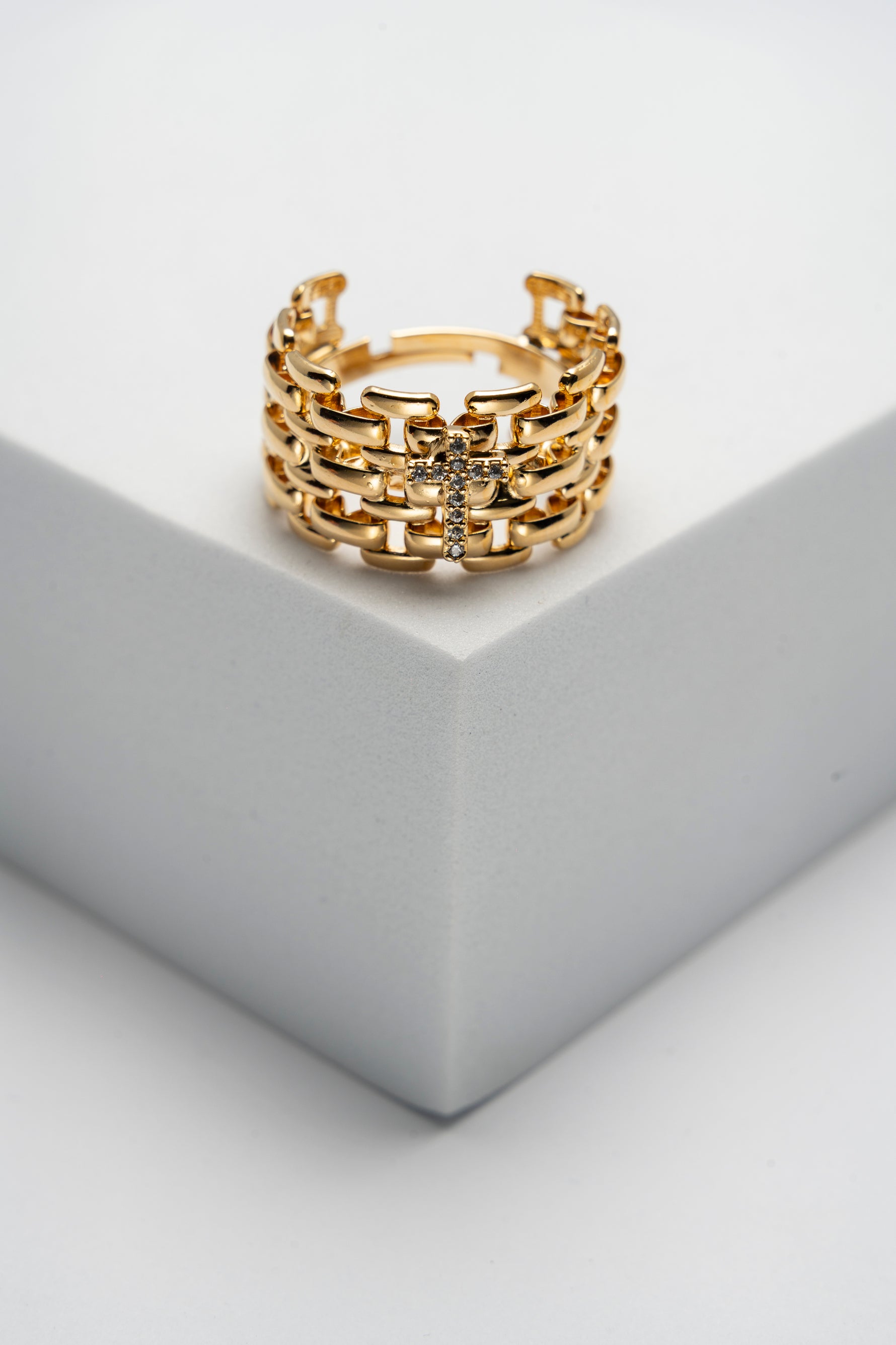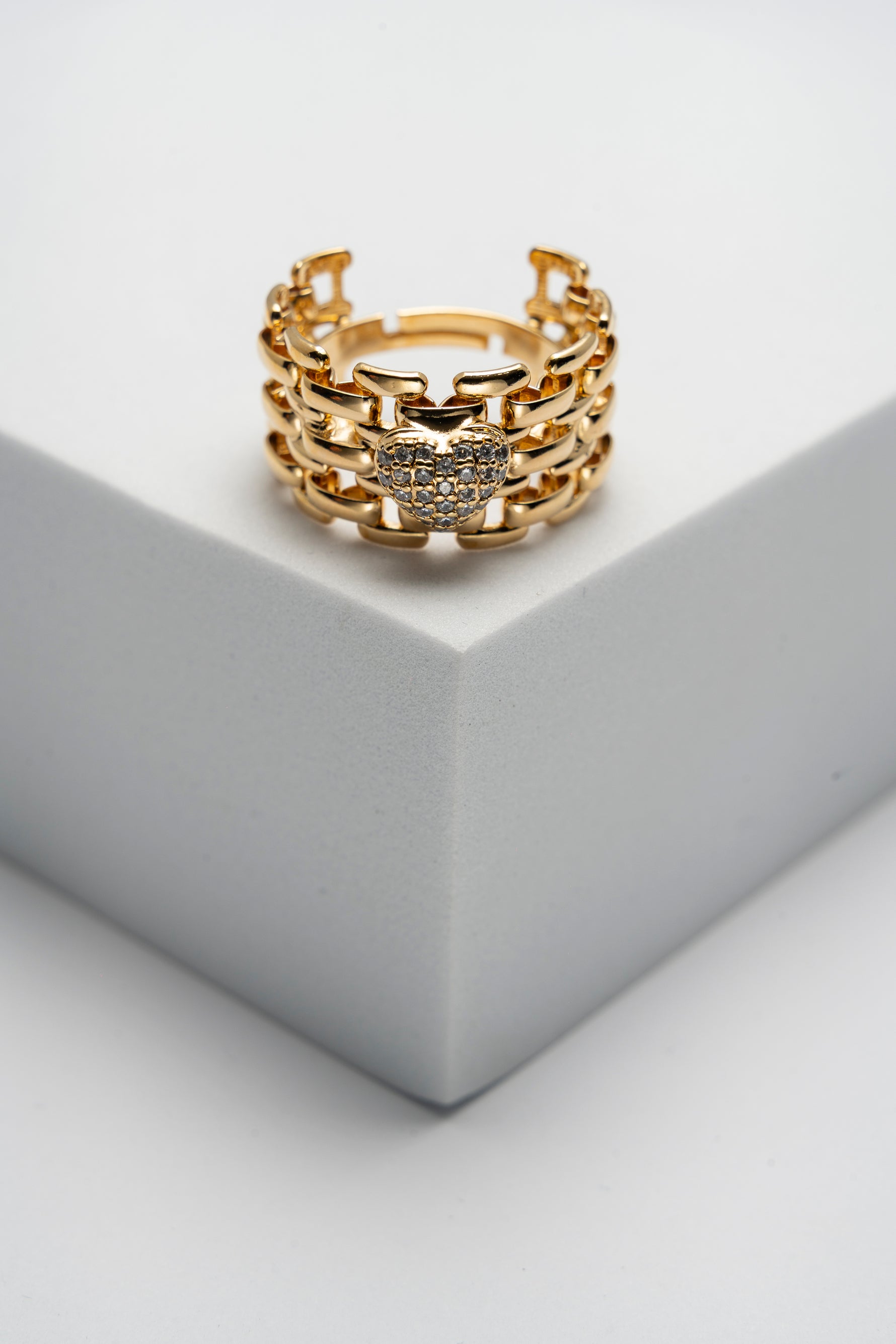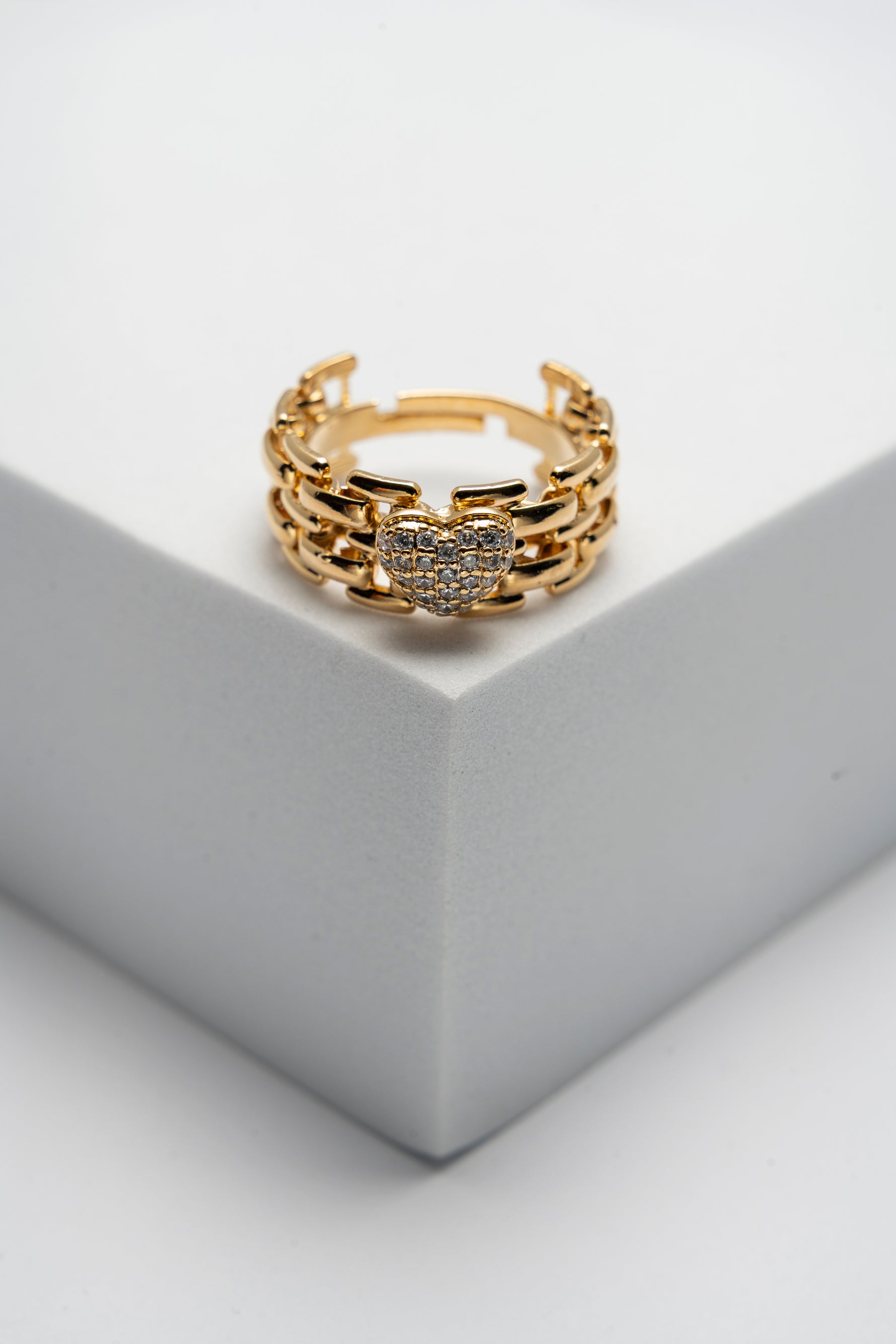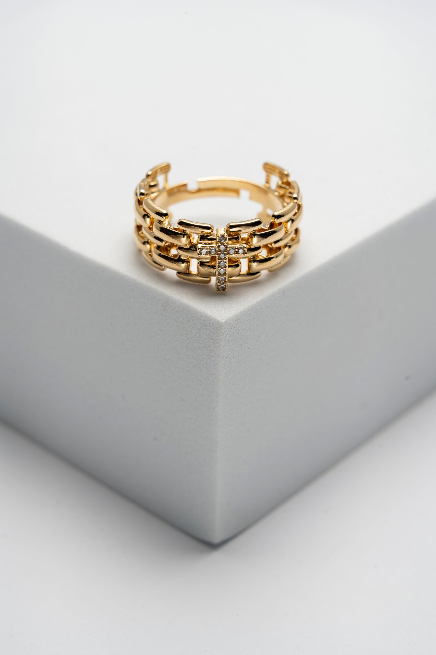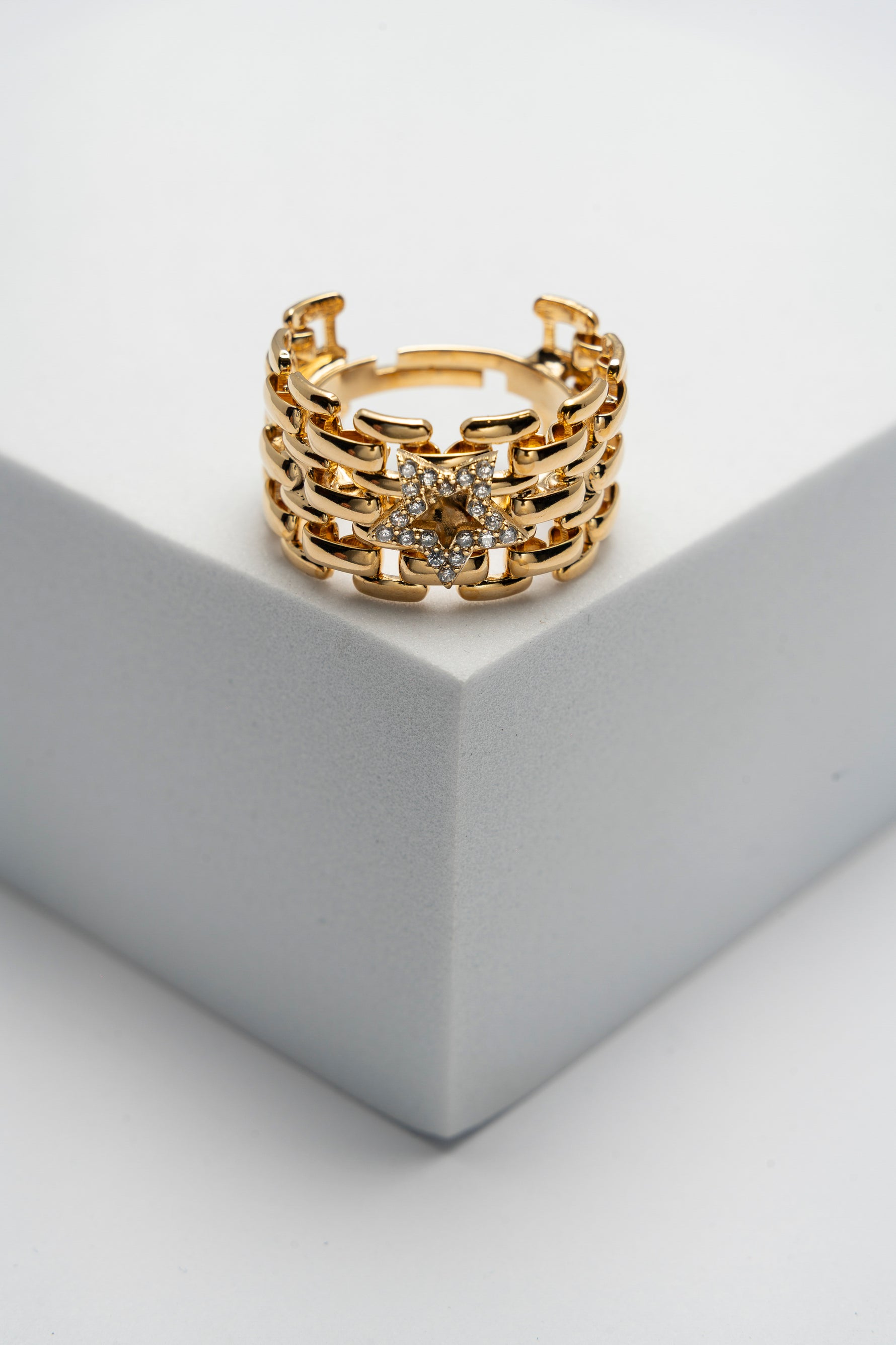 Anello dorato a catena regolabile, disponibile in due larghezze e quattro varianti: cuore, stella, croce o classico. Un’icona di stile e luce, da indossare ogni giorno.