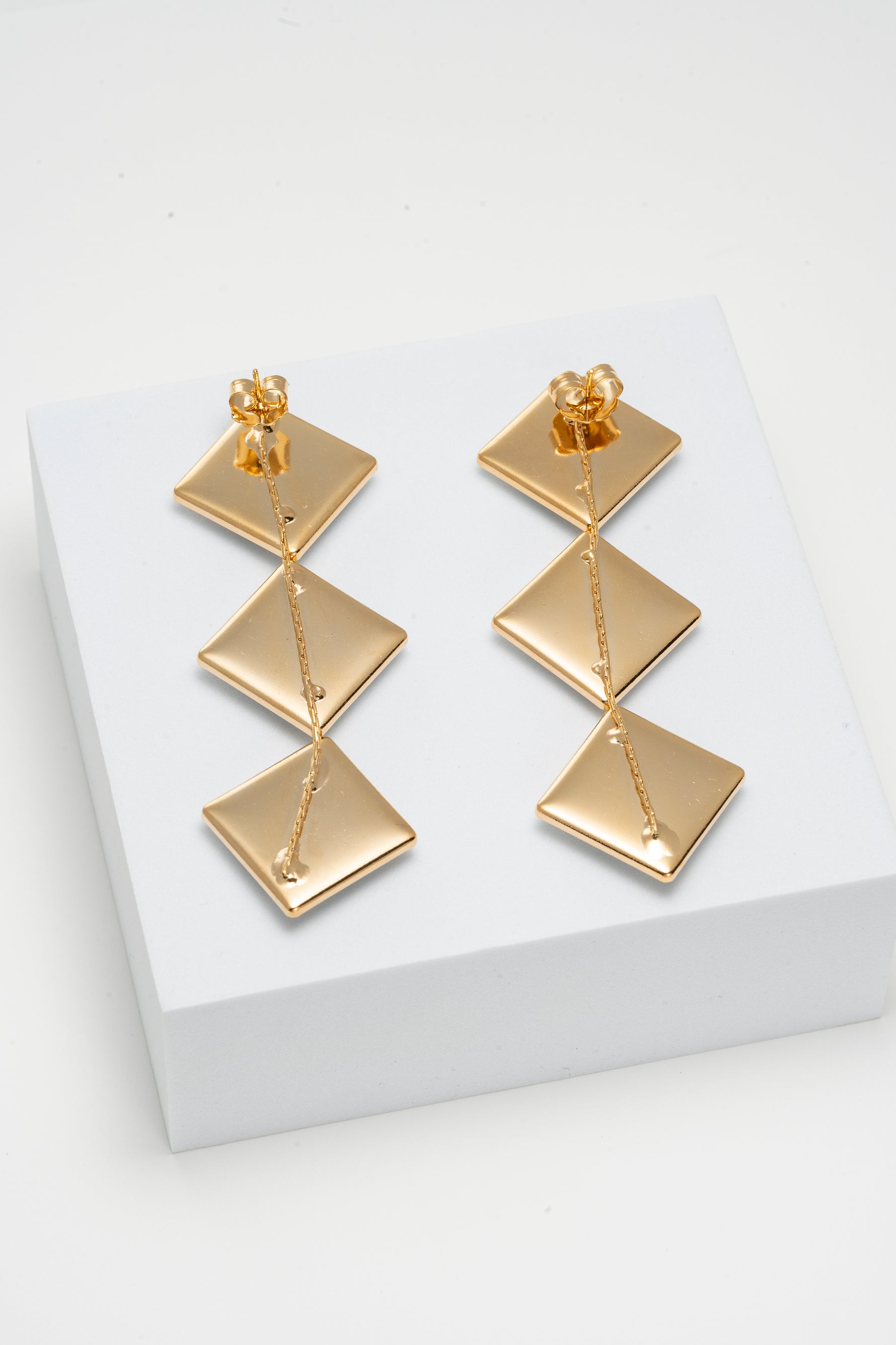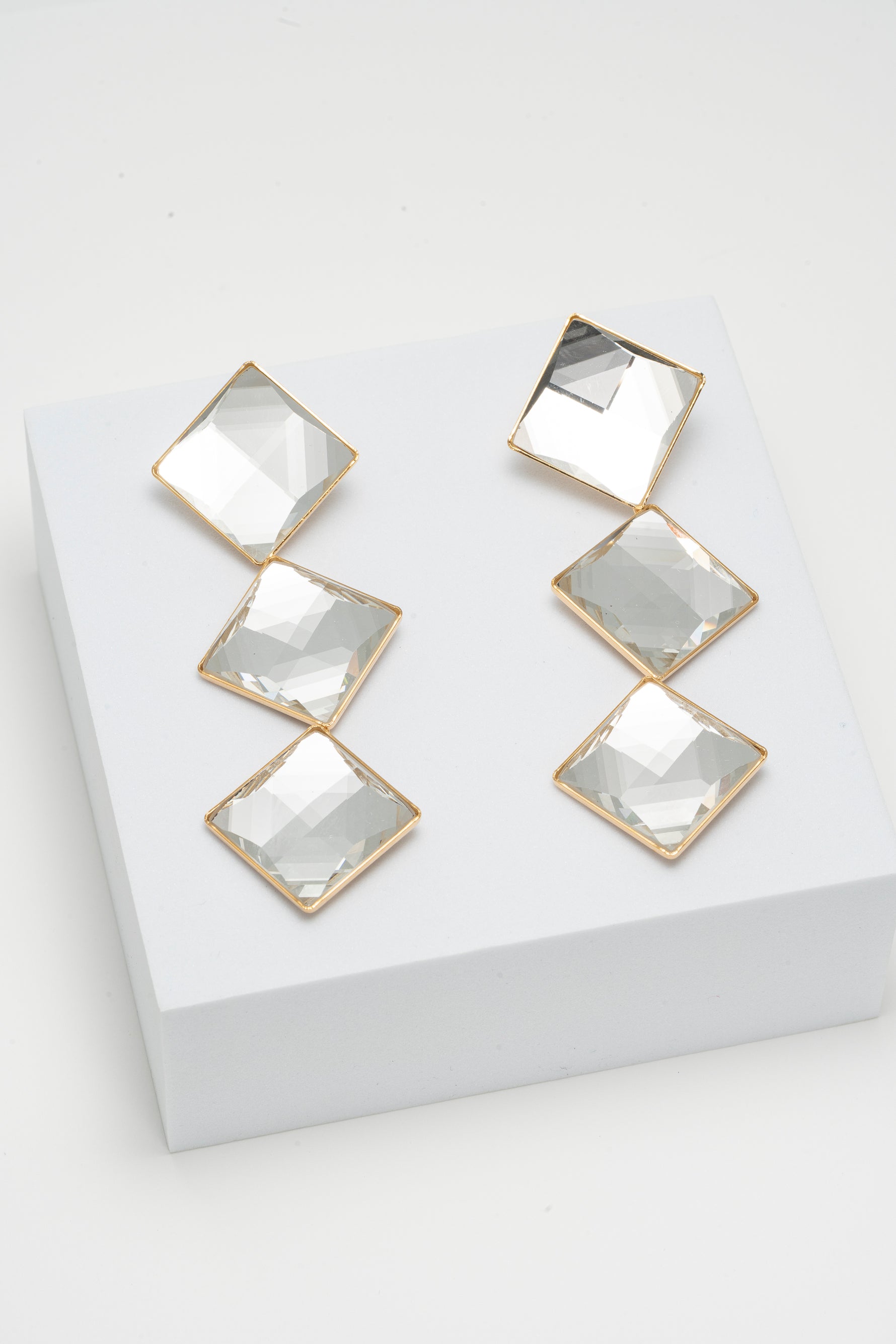 Frozen Steps è un modello che combina pulizia formale e brillantezza. Tre cristalli trasparenti a taglio quadrato, montati in sequenza verticale su una struttura sottile dorata, compongono un gioiello elegante e slanciato.