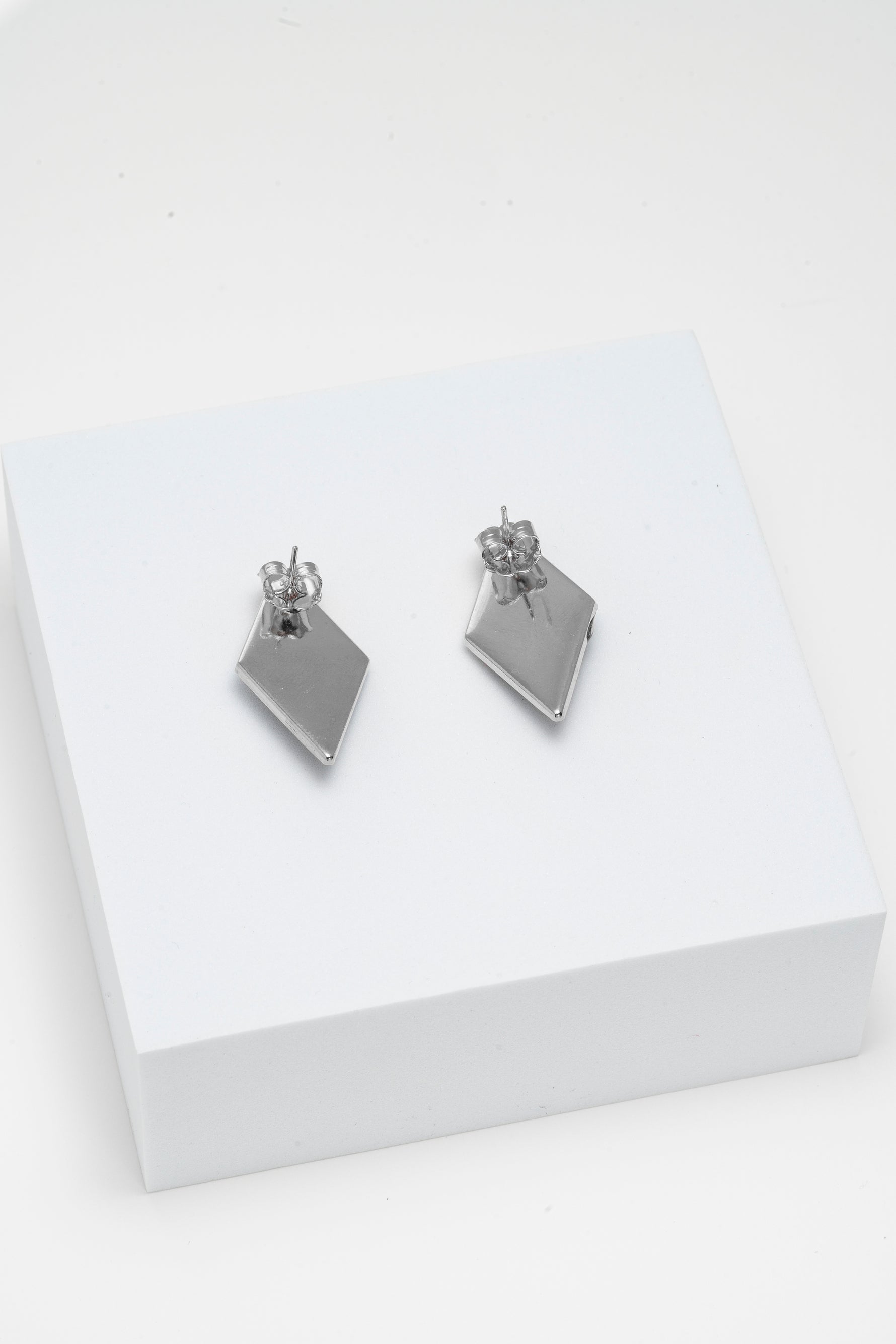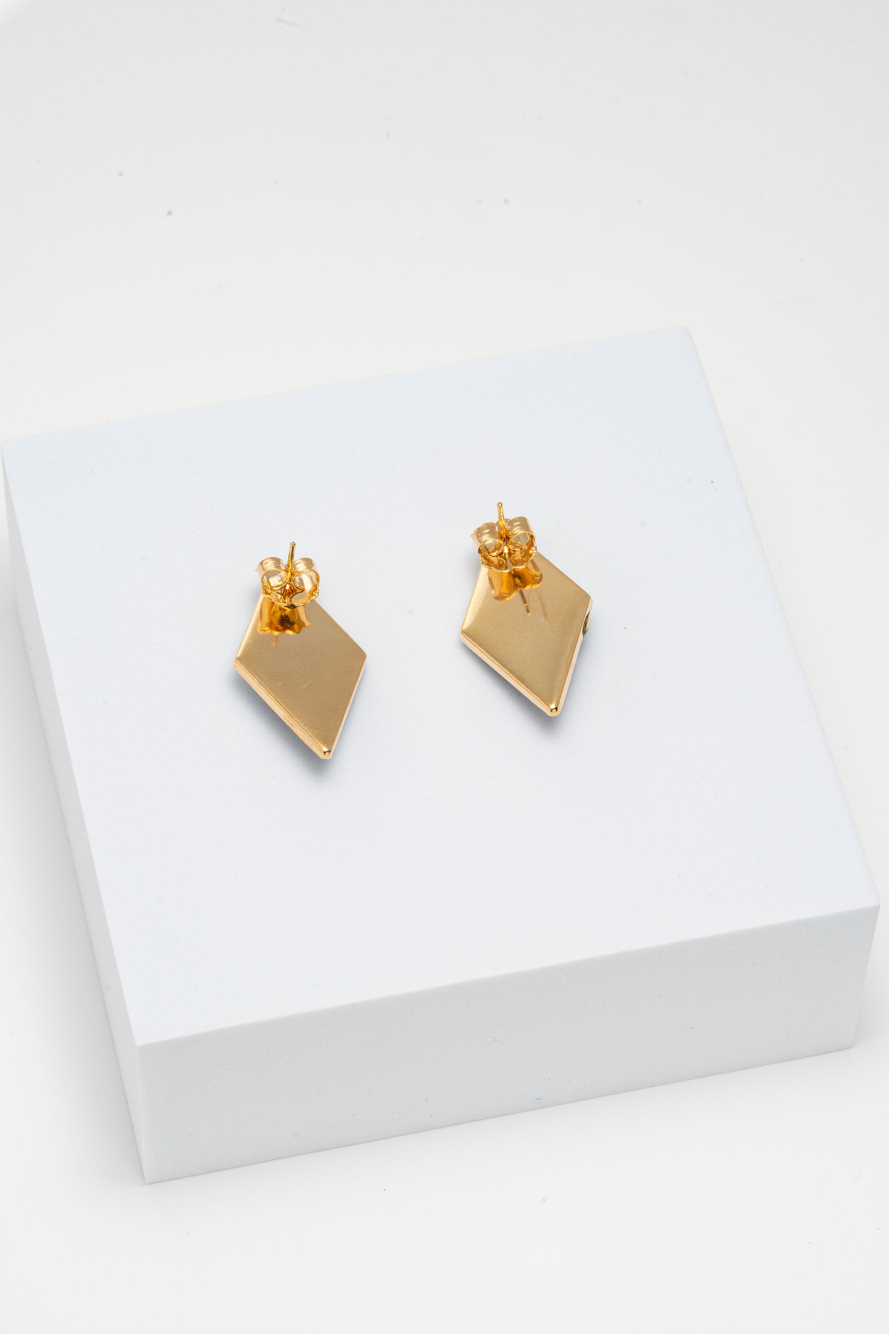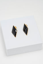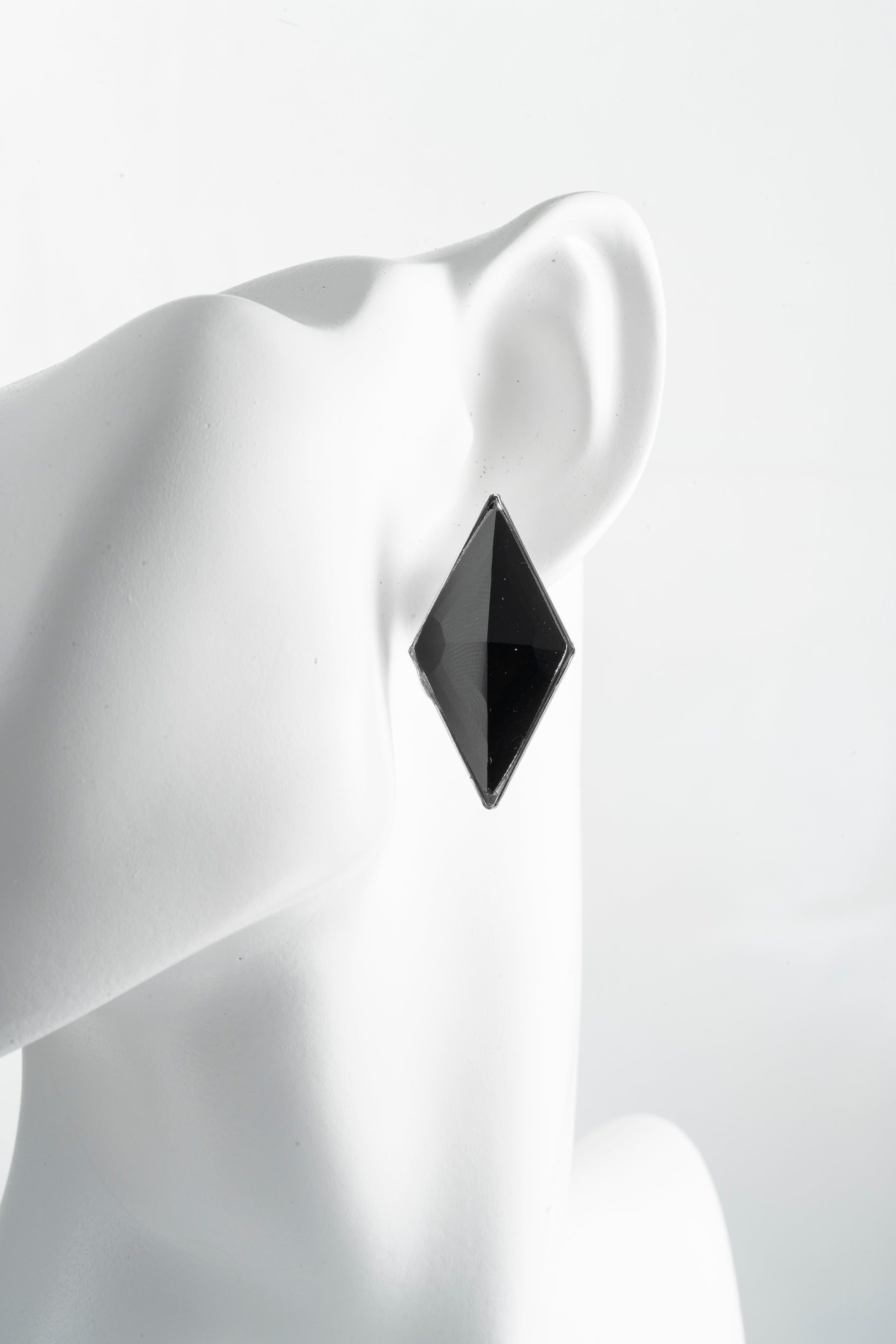 Eleganza tagliente in versione total black. Questi orecchini romboidali allungati sono realizzati in vetro sfaccettato nero profondo, incorniciato da una finitura dorata sottile. La forma affusolata dona verticalità al volto, perfetti per un look sofisticato o da sera.