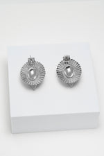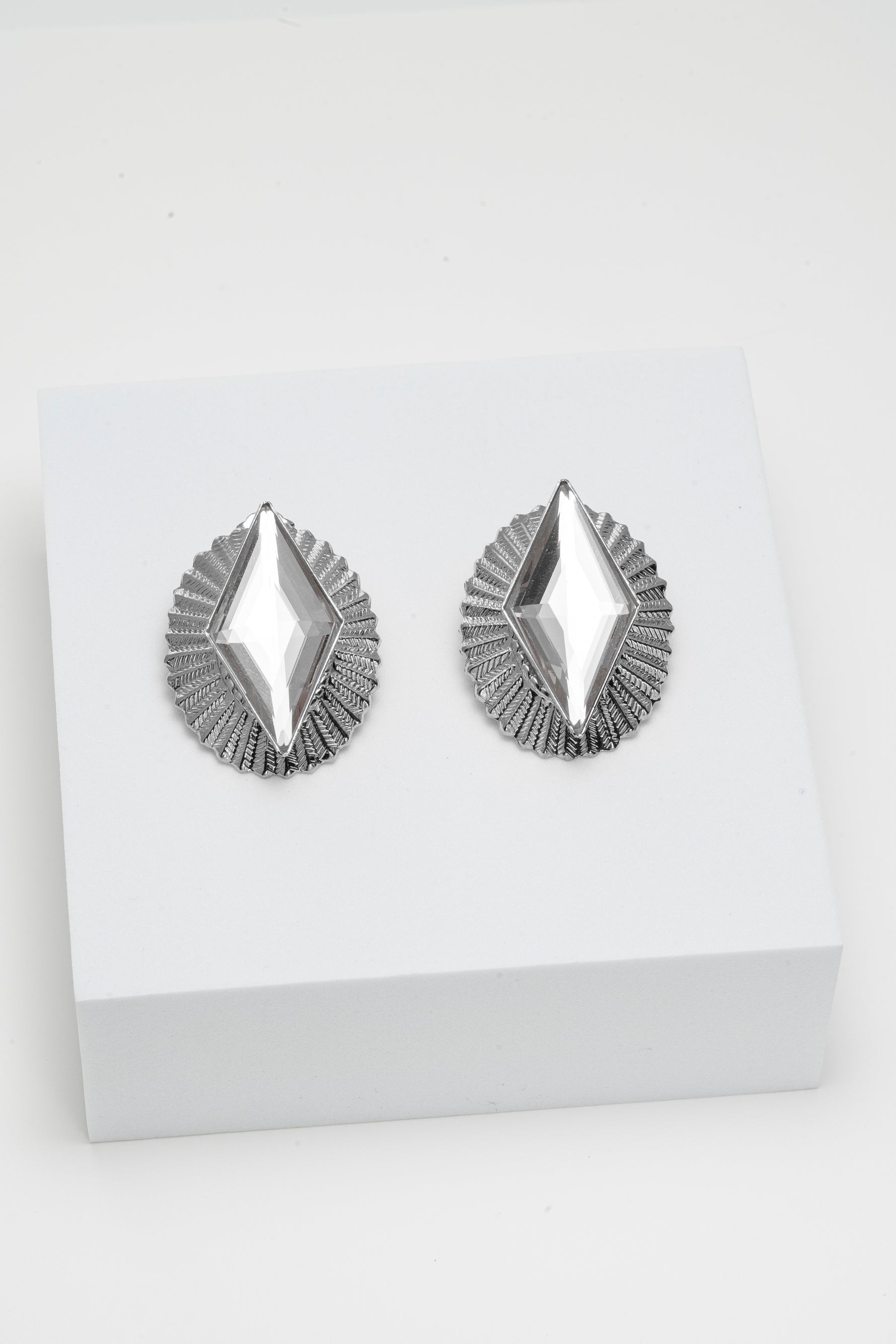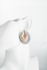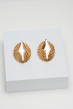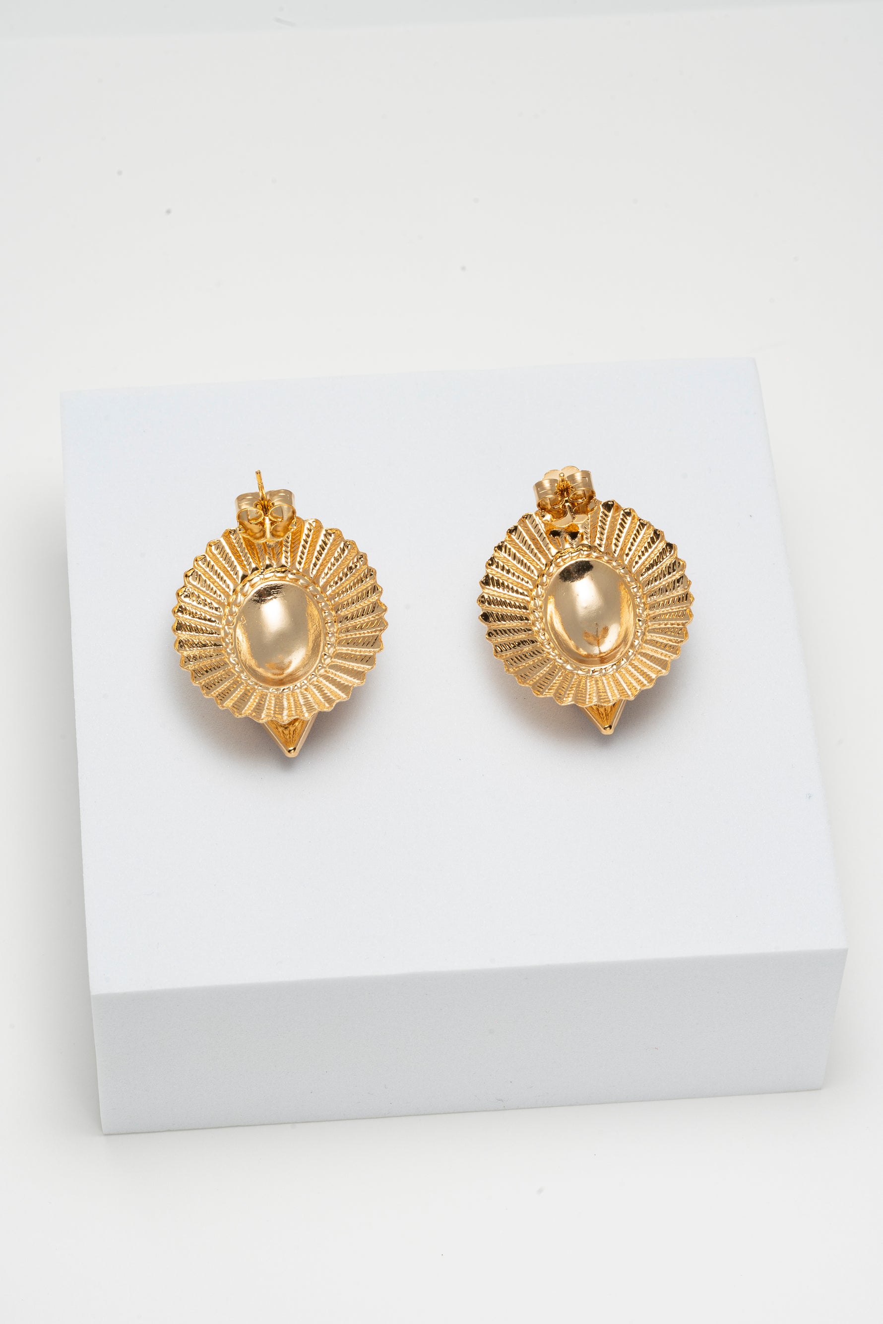 Gli orecchini Stellar Flame si distinguono per la loro forma slanciata e luminosa: un cristallo sfaccettato color light peach è incastonato in una montatura placcata oro con raffinati dettagli a raggiera. Il risultato è un gioiello che richiama la fiamma di una stella o la luce dorata del tramonto.