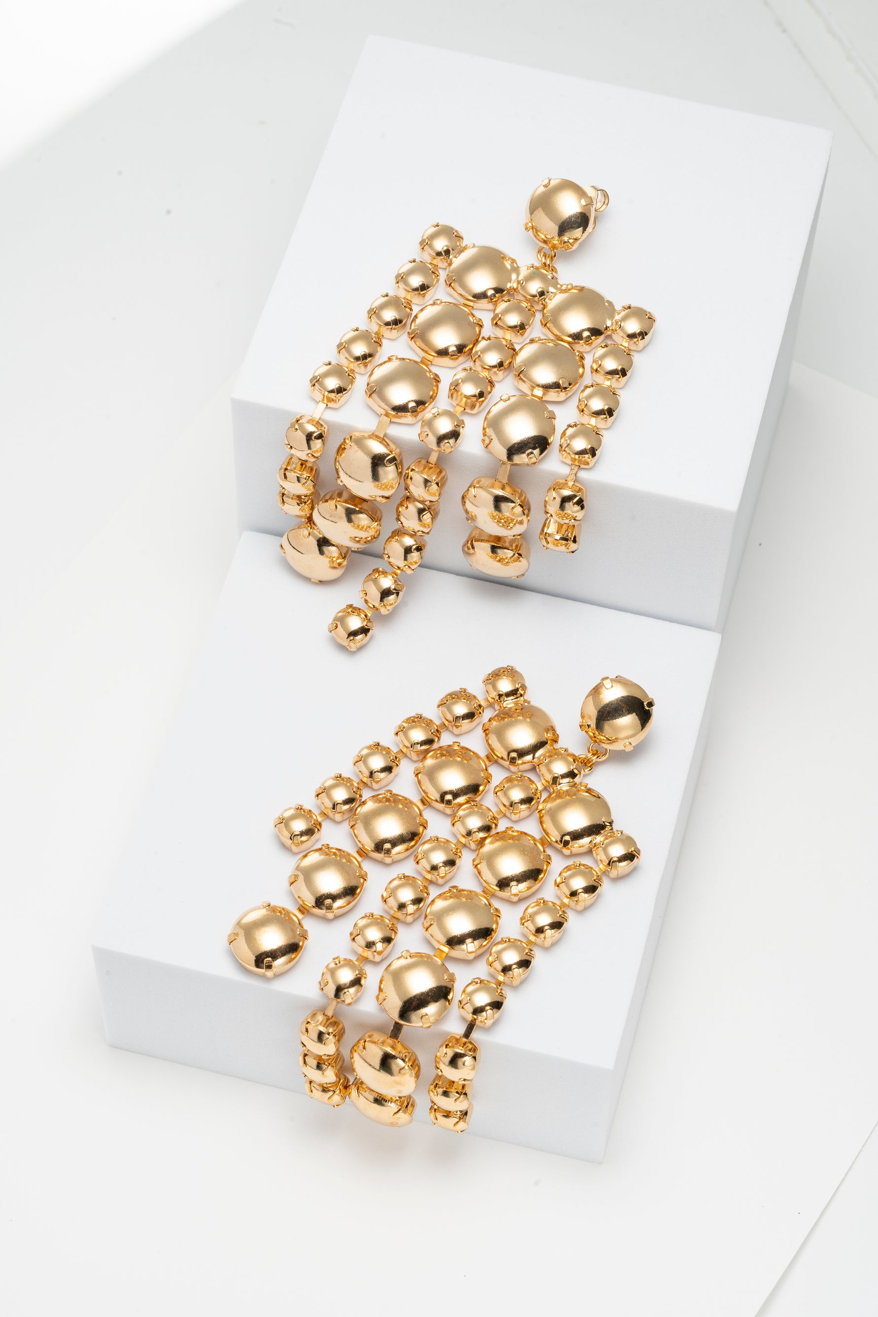 Gli orecchini Domina sono l’espressione di un’eleganza potente e fuori dagli schemi. Una composizione geometrica di sfere dorate che crea un effetto scultoreo e dinamico, pensato per chi non teme di farsi notare. Perfetti per eventi, sfilate o serate dove il dettaglio fa la differenza.