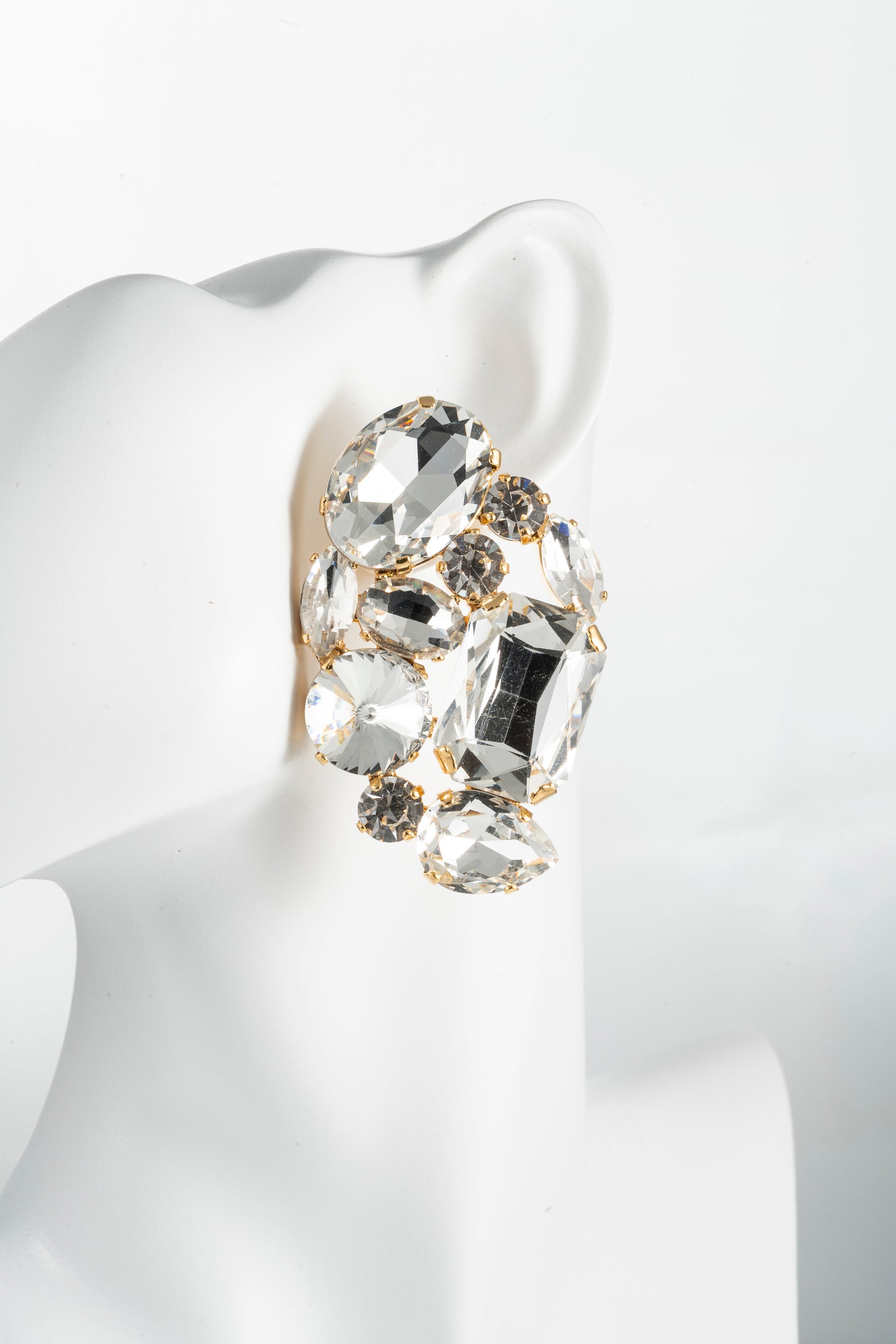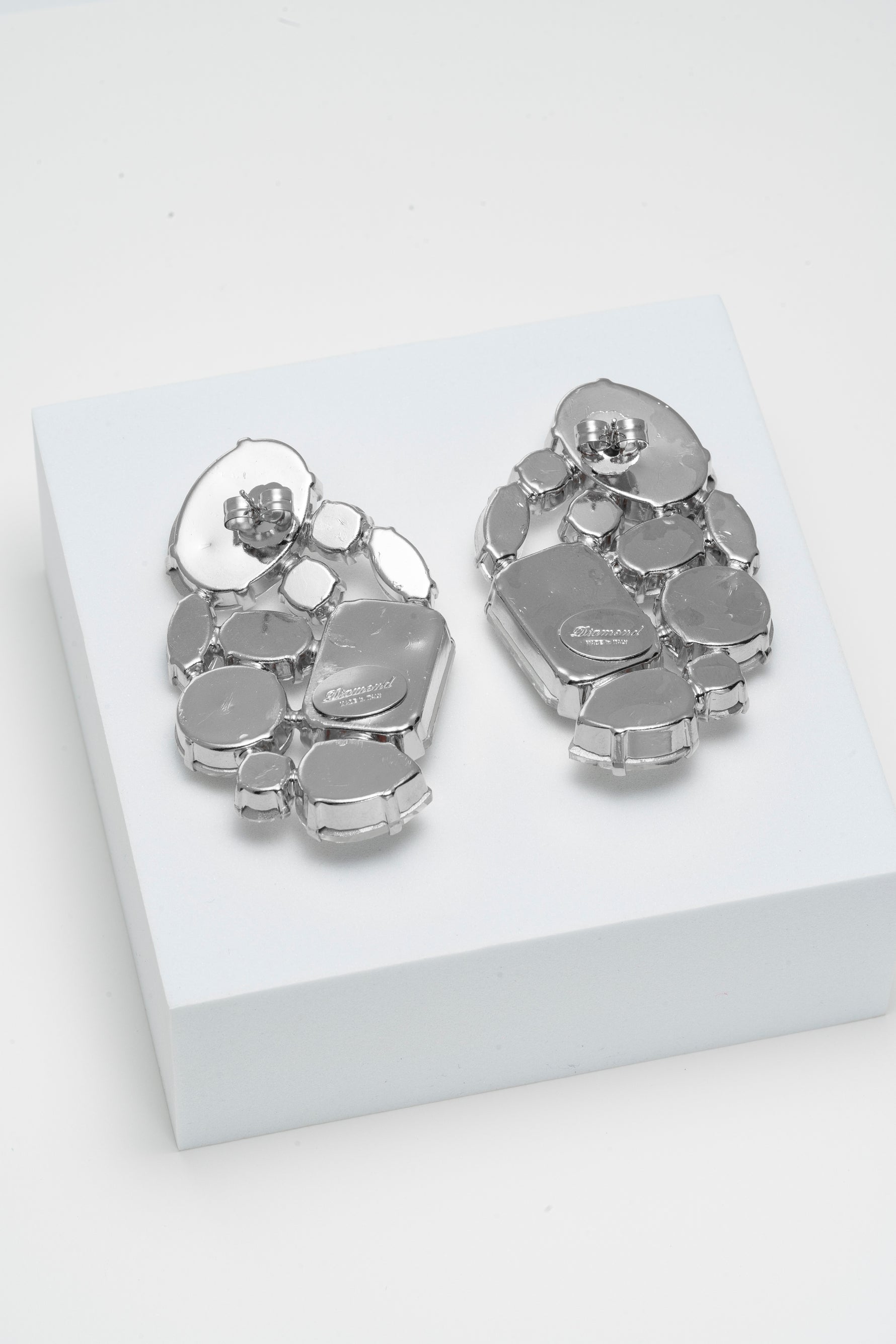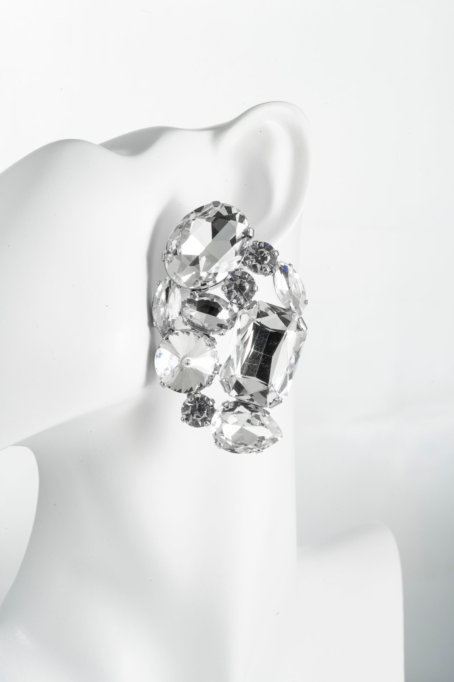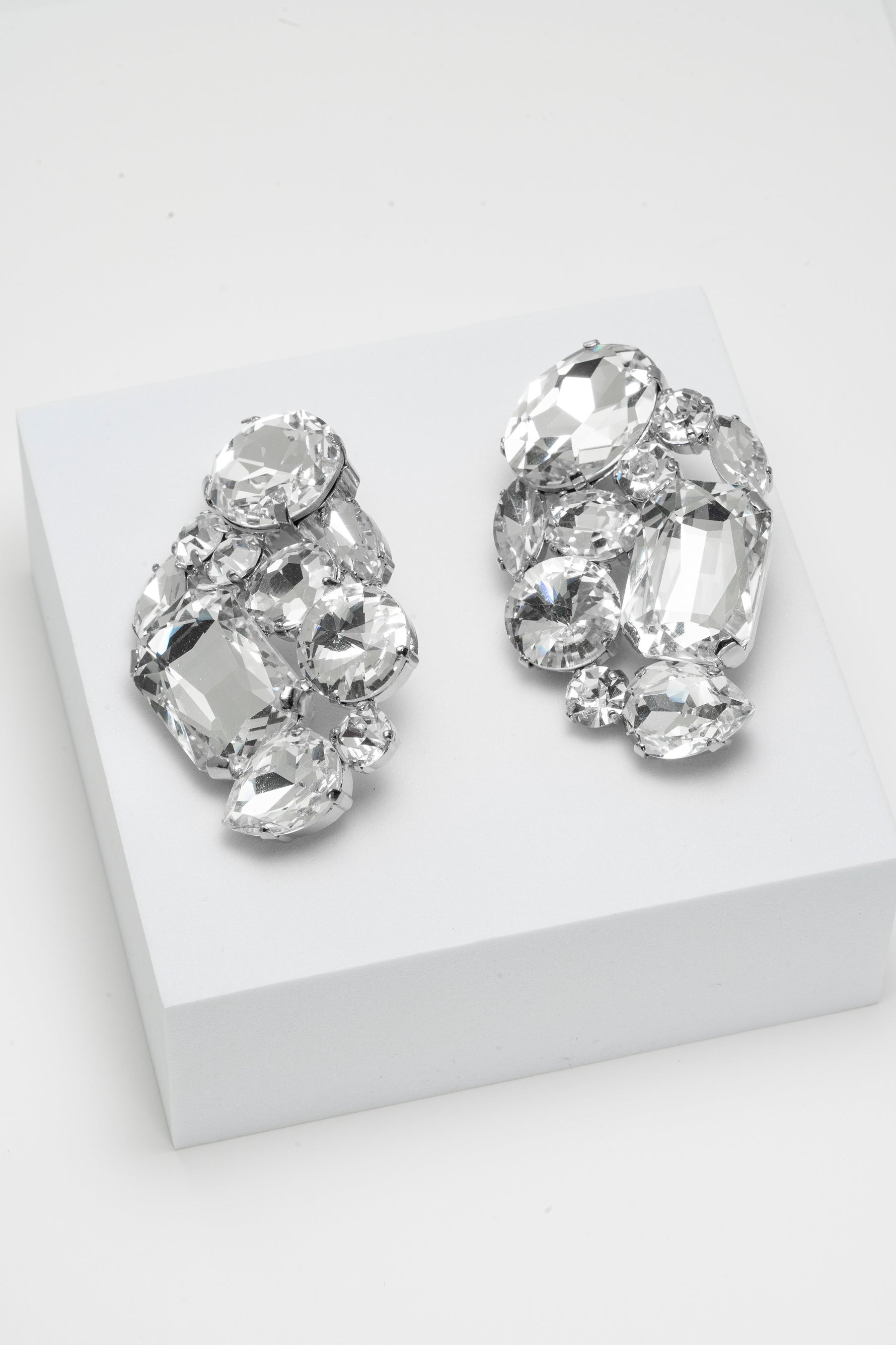 Crystal Storm è un'esplosione di luce, un gioiello scenografico pensato per chi ama farsi notare. Ogni orecchino presenta una composizione asimmetrica di cristalli trasparenti, incastonati in una struttura dorata. Le pietre, tutte tagliate con estrema precisione, variano in forma e dimensione: gocce, ovali, rotondi e rettangolari si sovrappongono in una danza di riflessi e brillantezza.