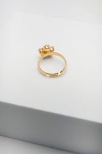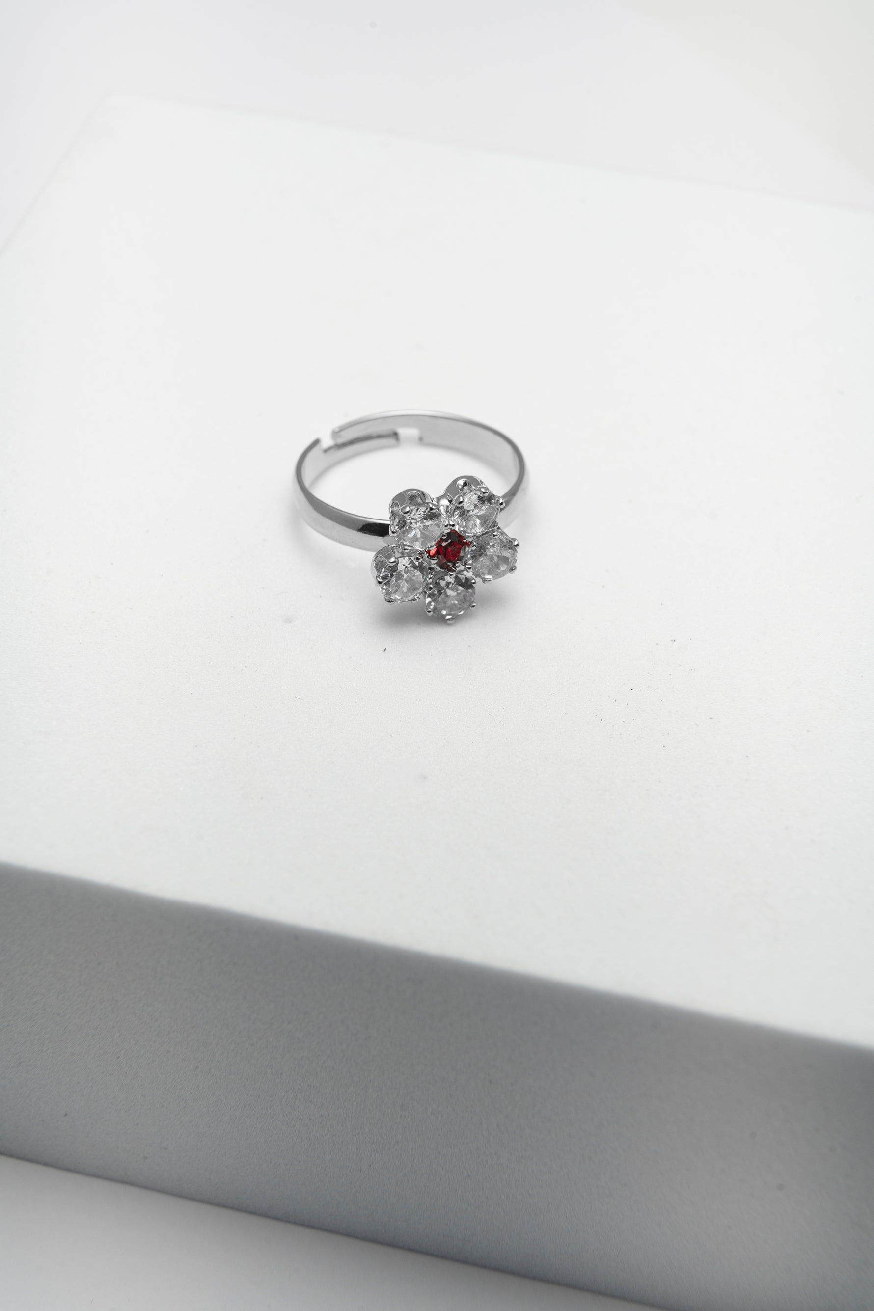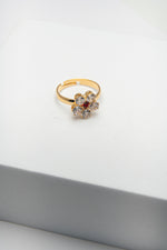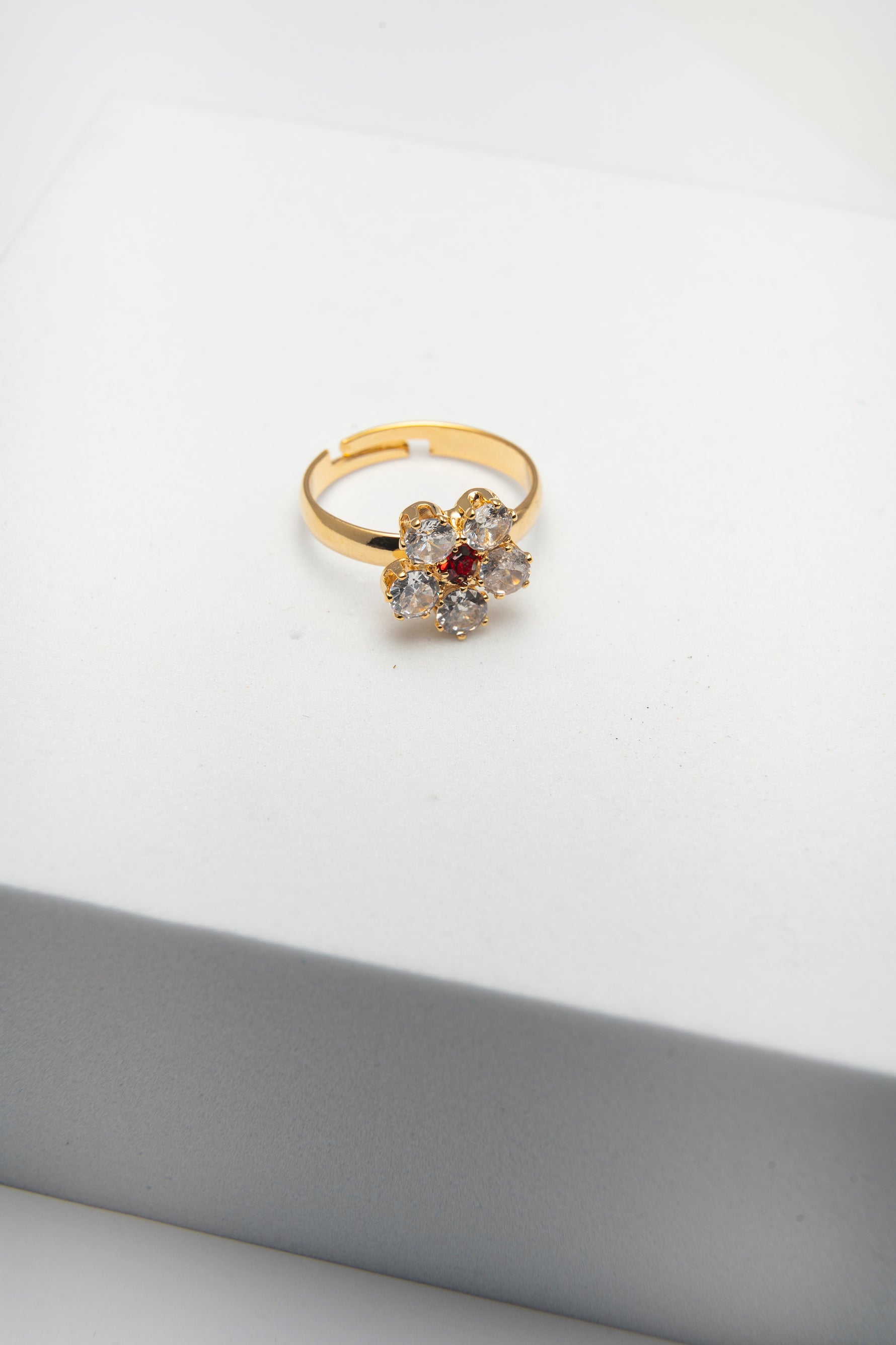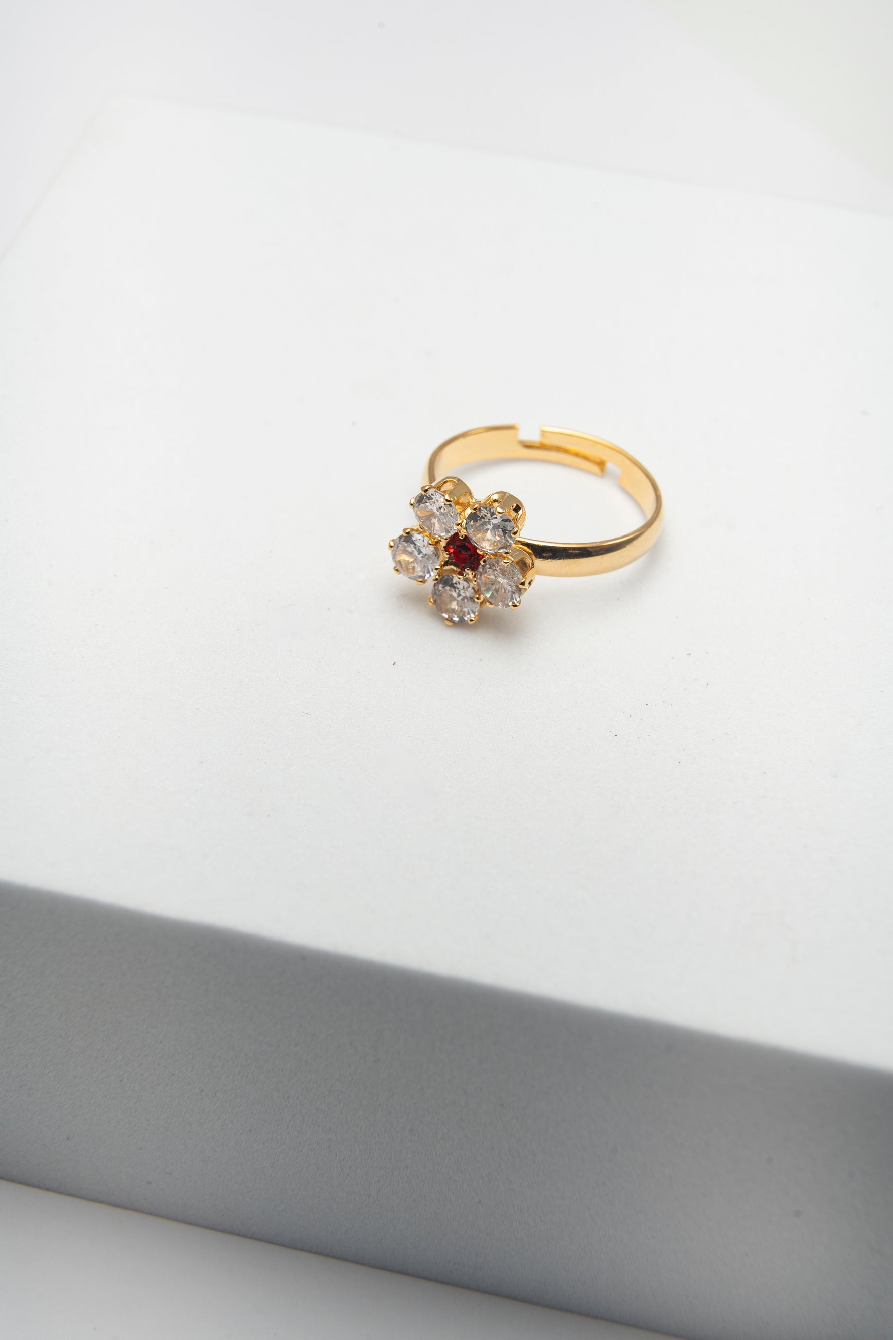 Anello dorato con fiore di cristalli bianchi e punto luce rosso al centro. Un gioiello luminoso e romantico, simbolo di eleganza e passione.