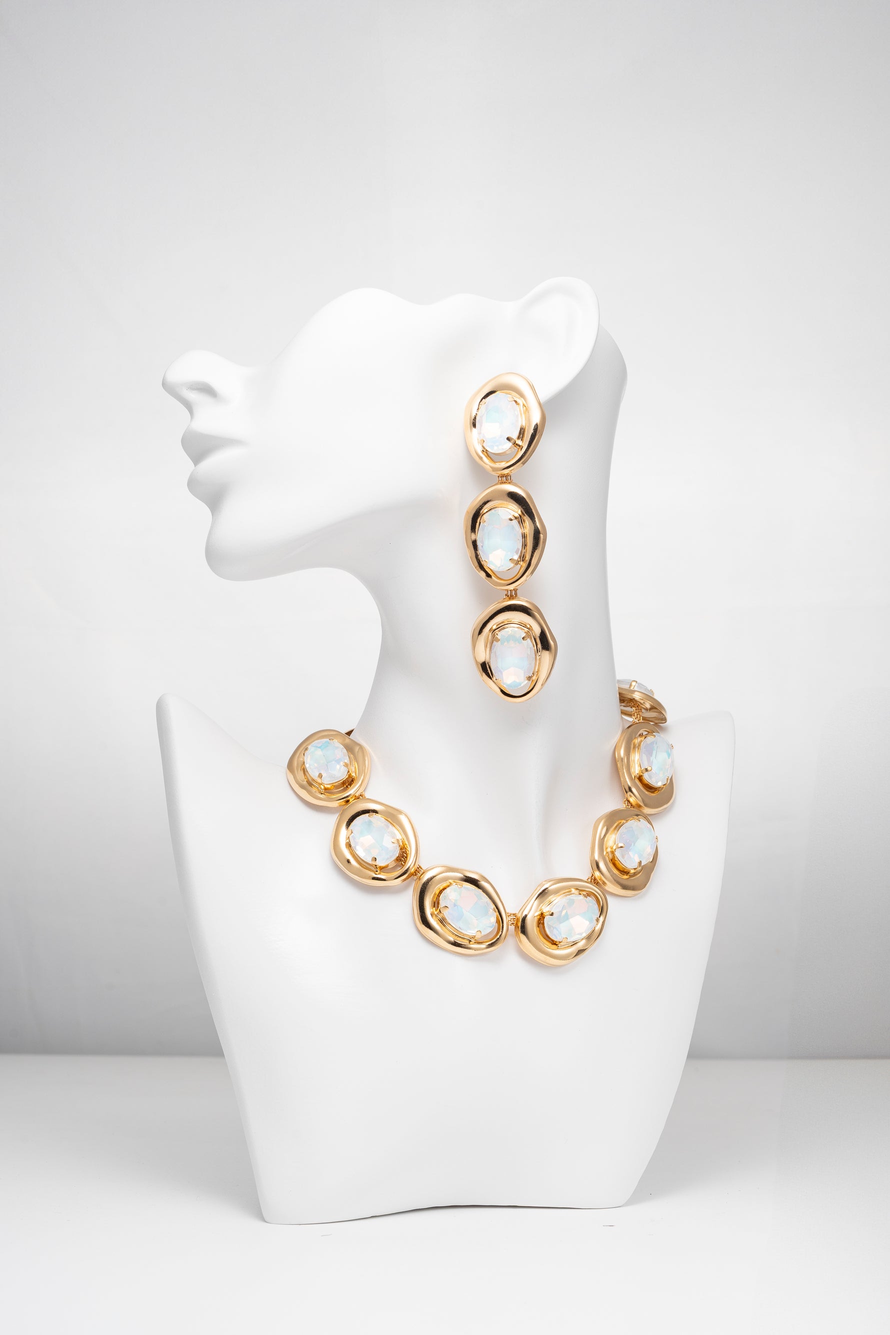 Realizzato con una montatura dorata dalle linee morbide e scultoree, il set si distingue per l’intensa luminosità dei cristalli effetto opale, capaci di riflettere ogni sfumatura della luce in un gioco di bagliori iridescenti.