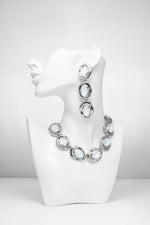 La collana Eira, con i suoi elementi regolari e armoniosi, avvolge il collo con eleganza; gli orecchini Eira, pendenti incorniciano il viso con un tocco di brillantezza sofisticata.