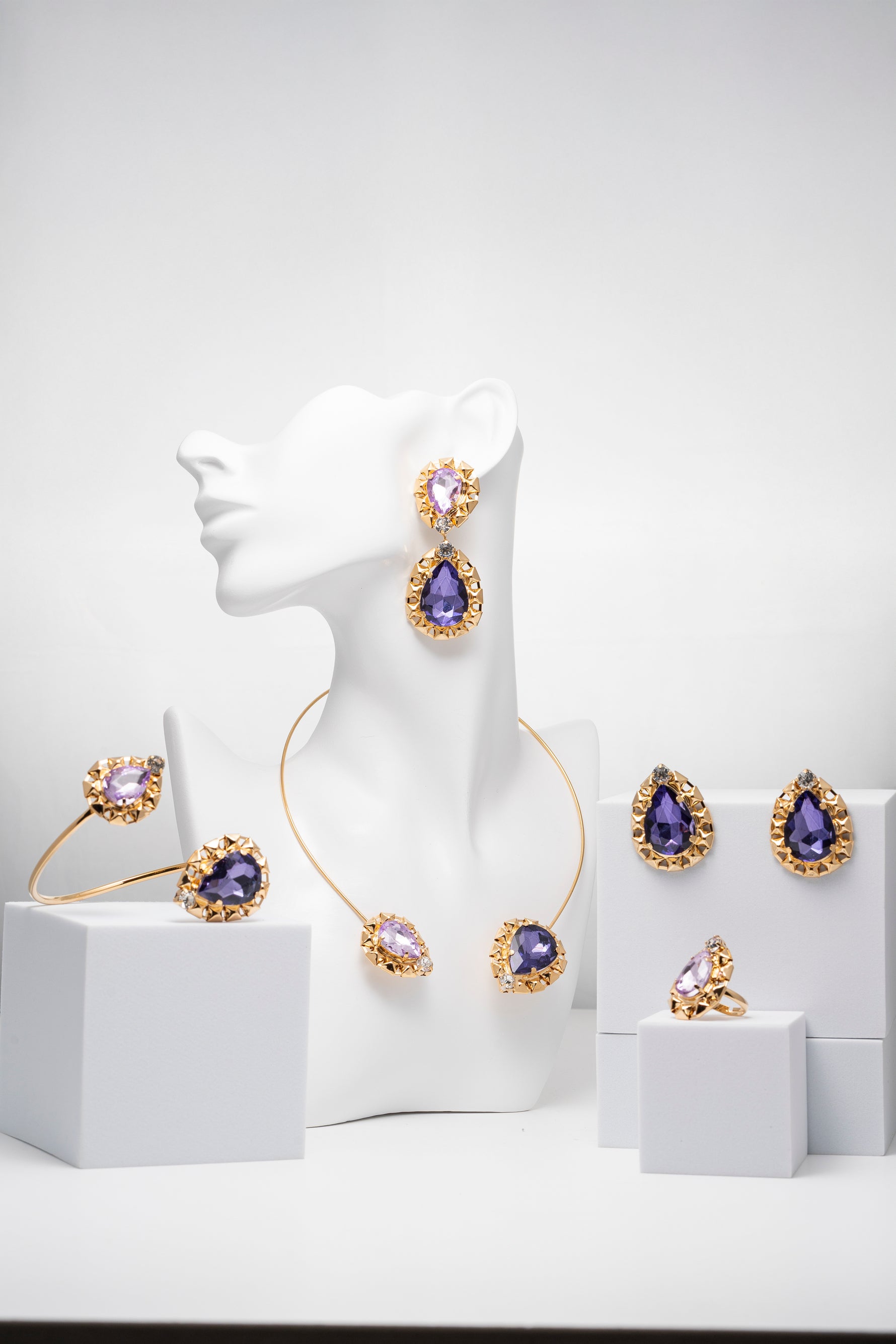 Un set gioiello sontuoso, dove l’oro lucente incontra le sfumature viola di pietre luminose, per un’eleganza ispirata all’arte barocca e al fascino delle corti imperiali.