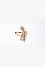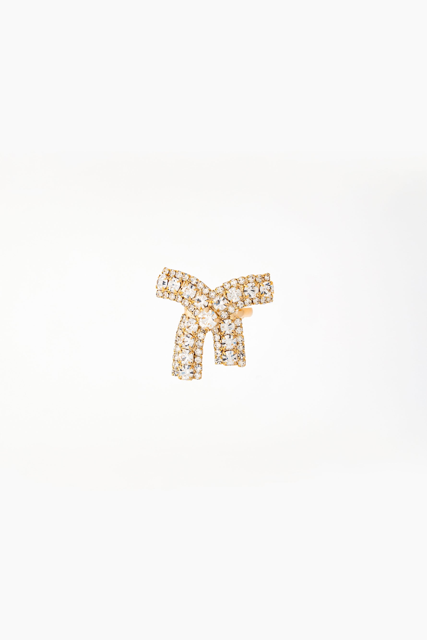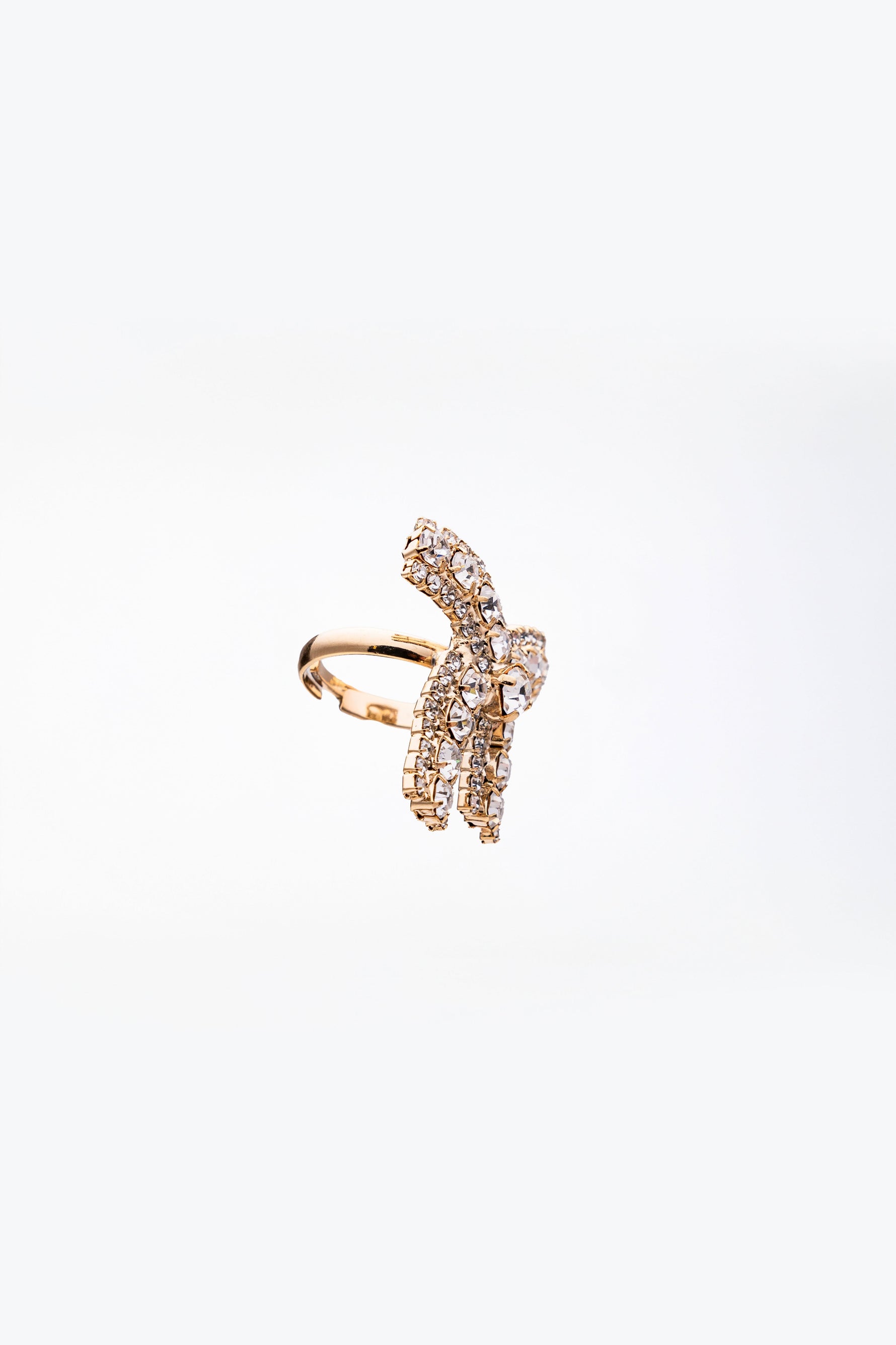 Un anello dal design sofisticato e femminile, caratterizzato da un fiocco luminoso tempestato di strass su una base in ottone dorato free nickel. Un accessorio glamour e raffinato, perfetto per aggiungere un tocco di brillantezza a qualsiasi look.