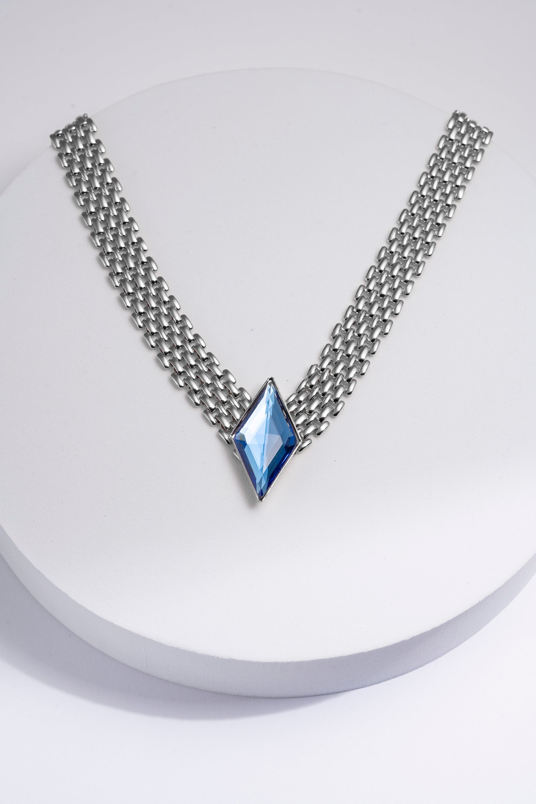 La catena dorata a maglie larghe accoglie un cristallo blu intenso, scolpito in un elegante taglio romboidale che riflette la luce con straordinaria vivacità. Un design raffinato e deciso, pensato per valorizzare ogni scollatura e donare un tocco di classe a qualsiasi outfit.