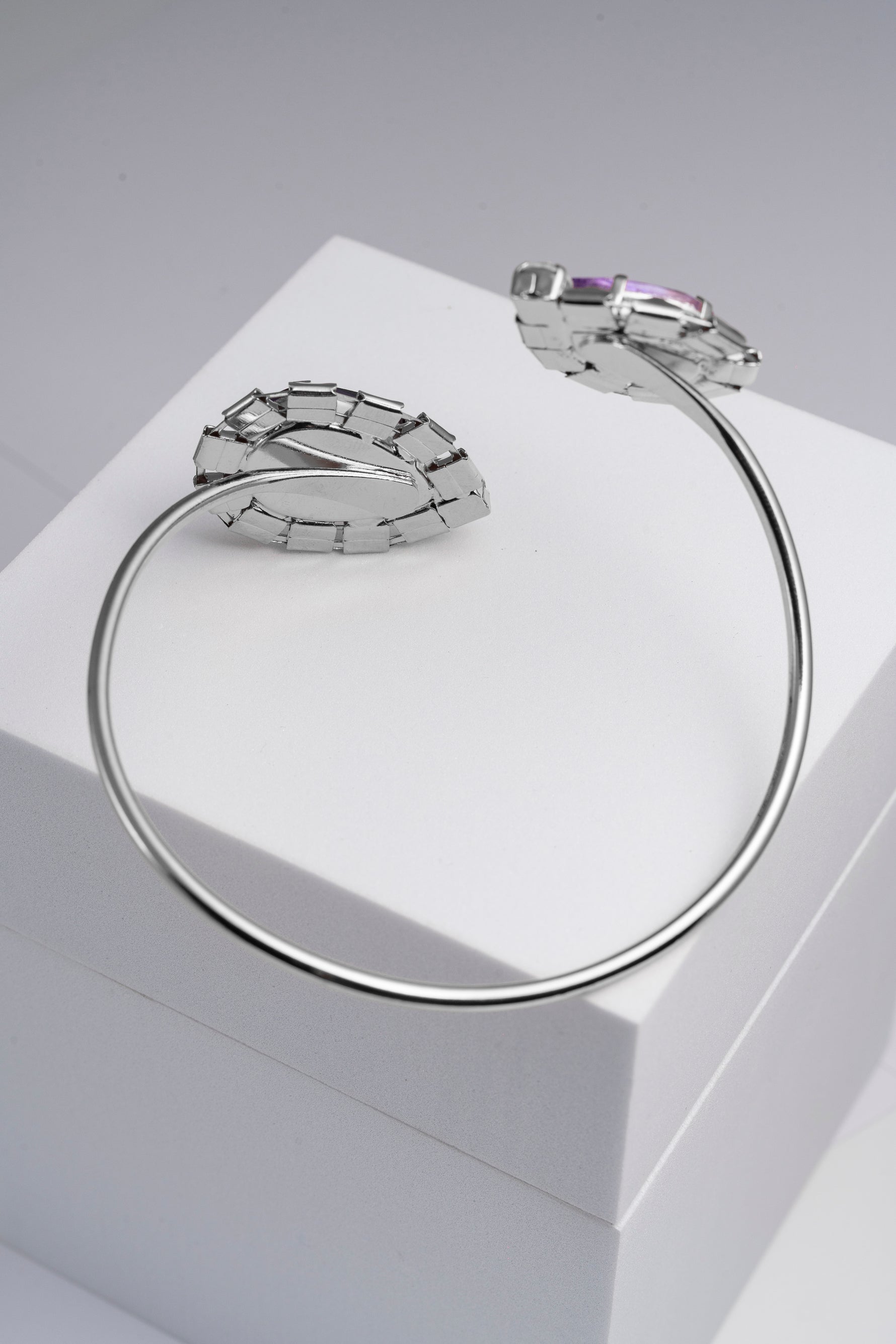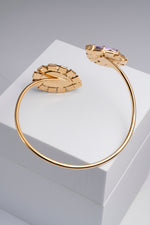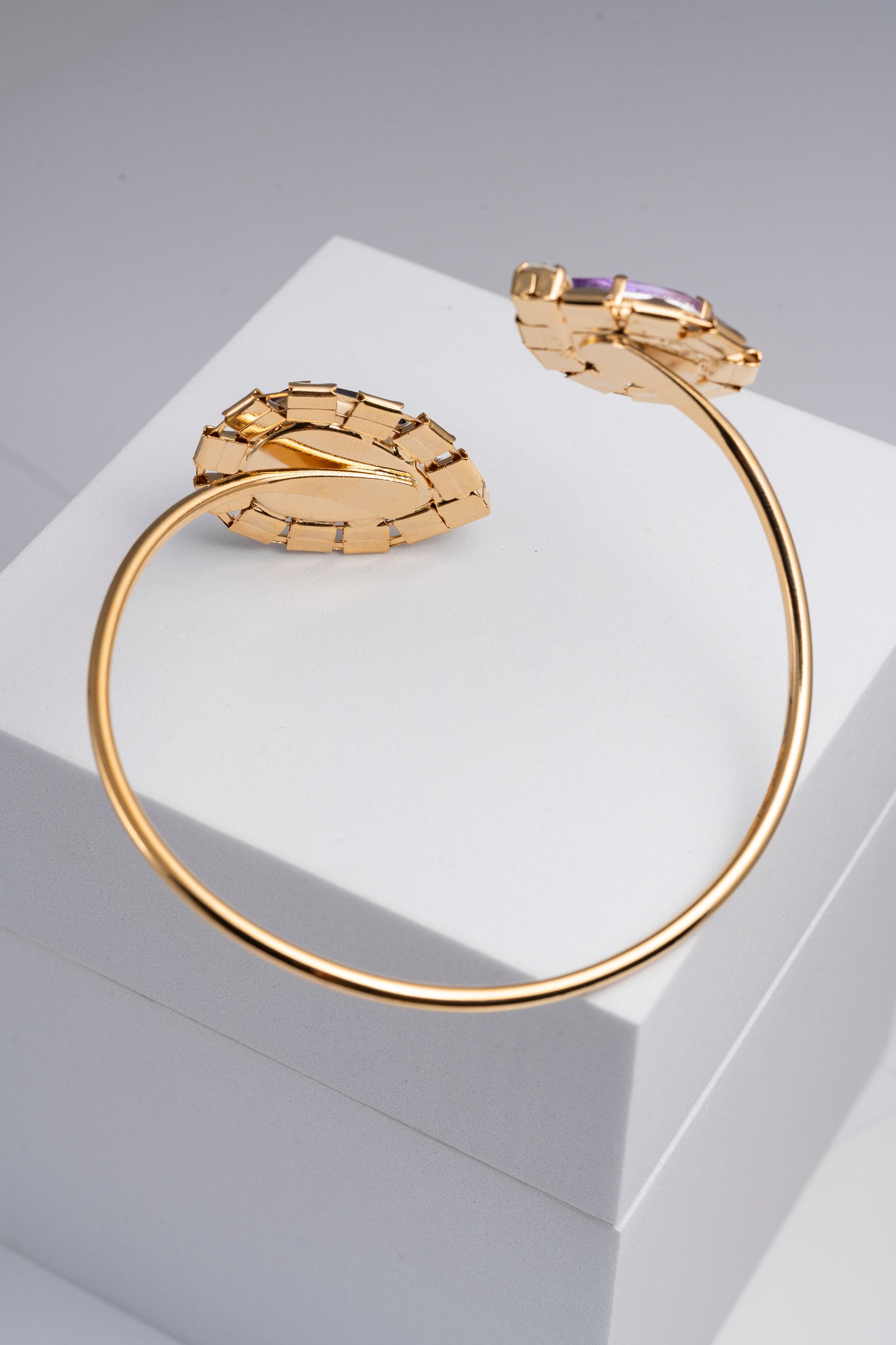 Un raffinato bracciale aperto in oro con due gocce di cristallo ametista, incastonate in una cornice barocca dal fascino luminoso e sofisticato. Perfetto per aggiungere un tocco regale a ogni look.