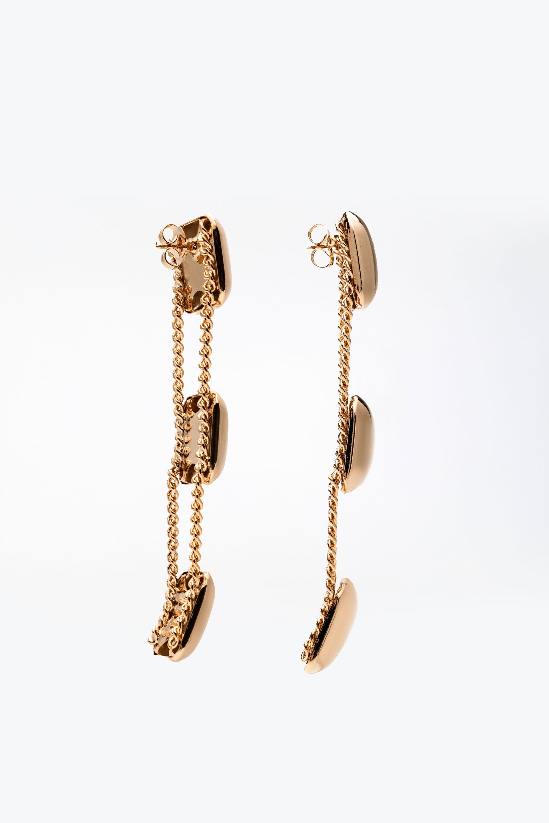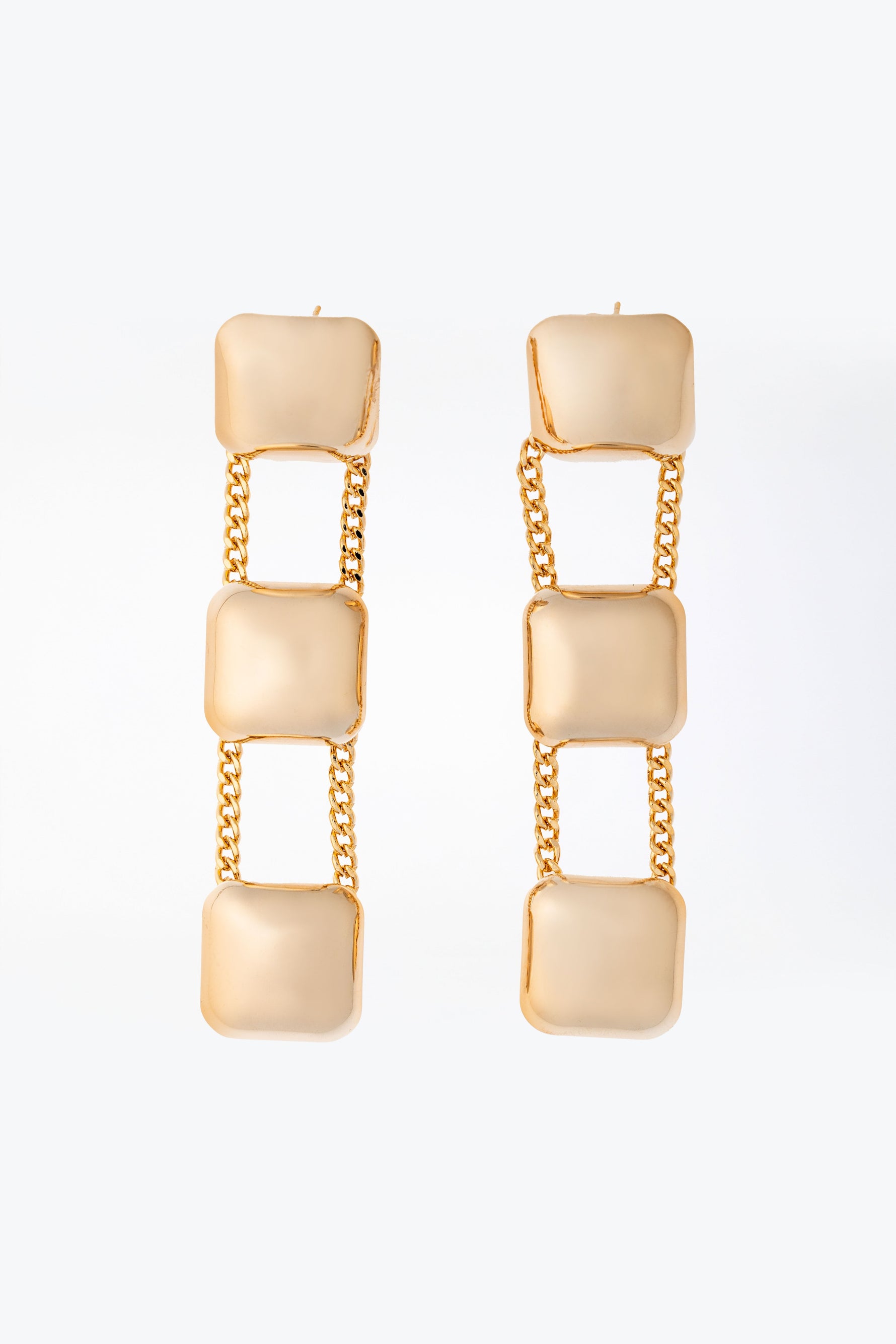 Un design audace e contemporaneo caratterizza questi orecchini composti da elementi squadrati uniti da delicate catene dorate. Perfetti per chi ama accessori raffinati ma dal forte impatto visivo.
