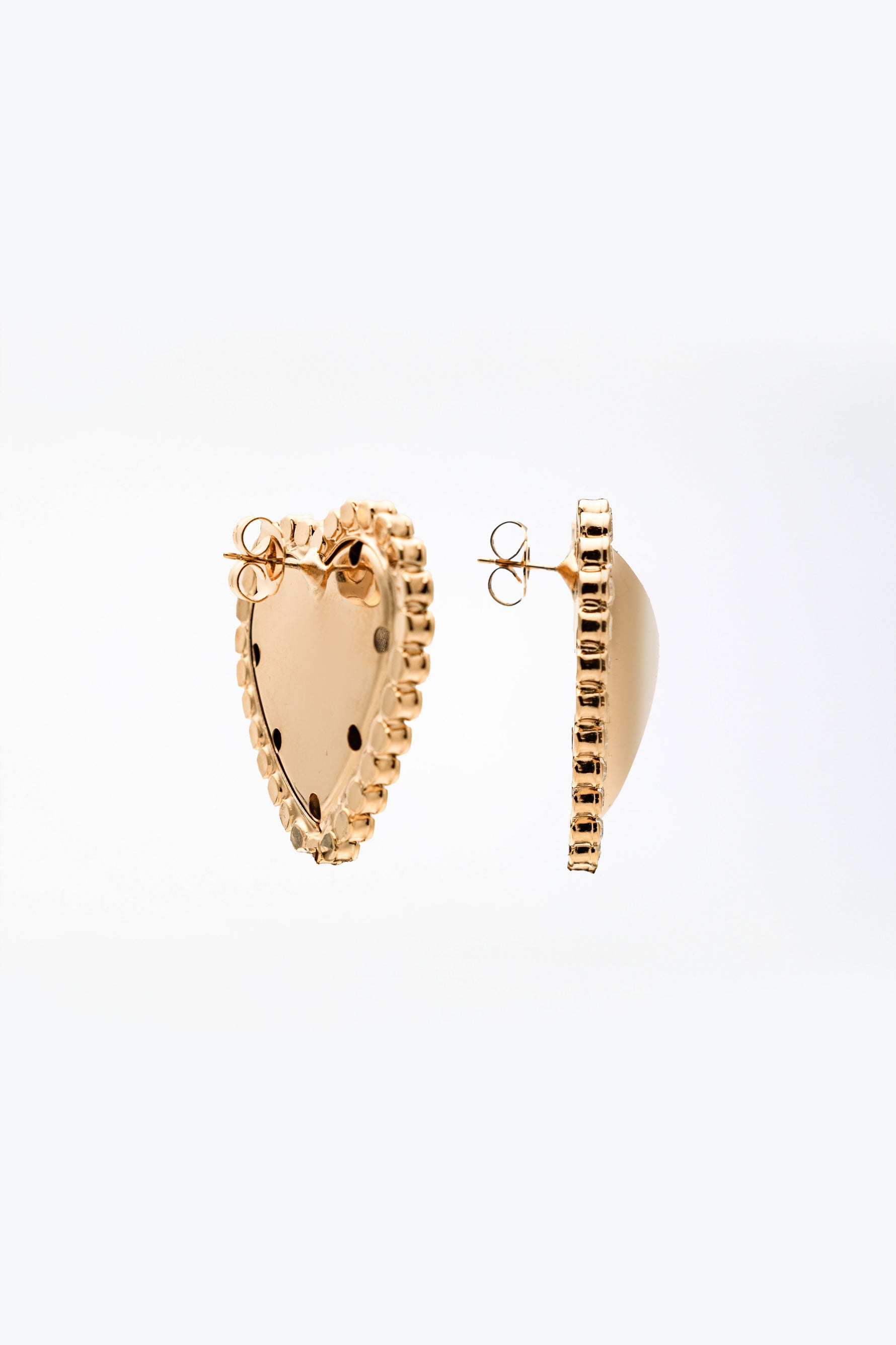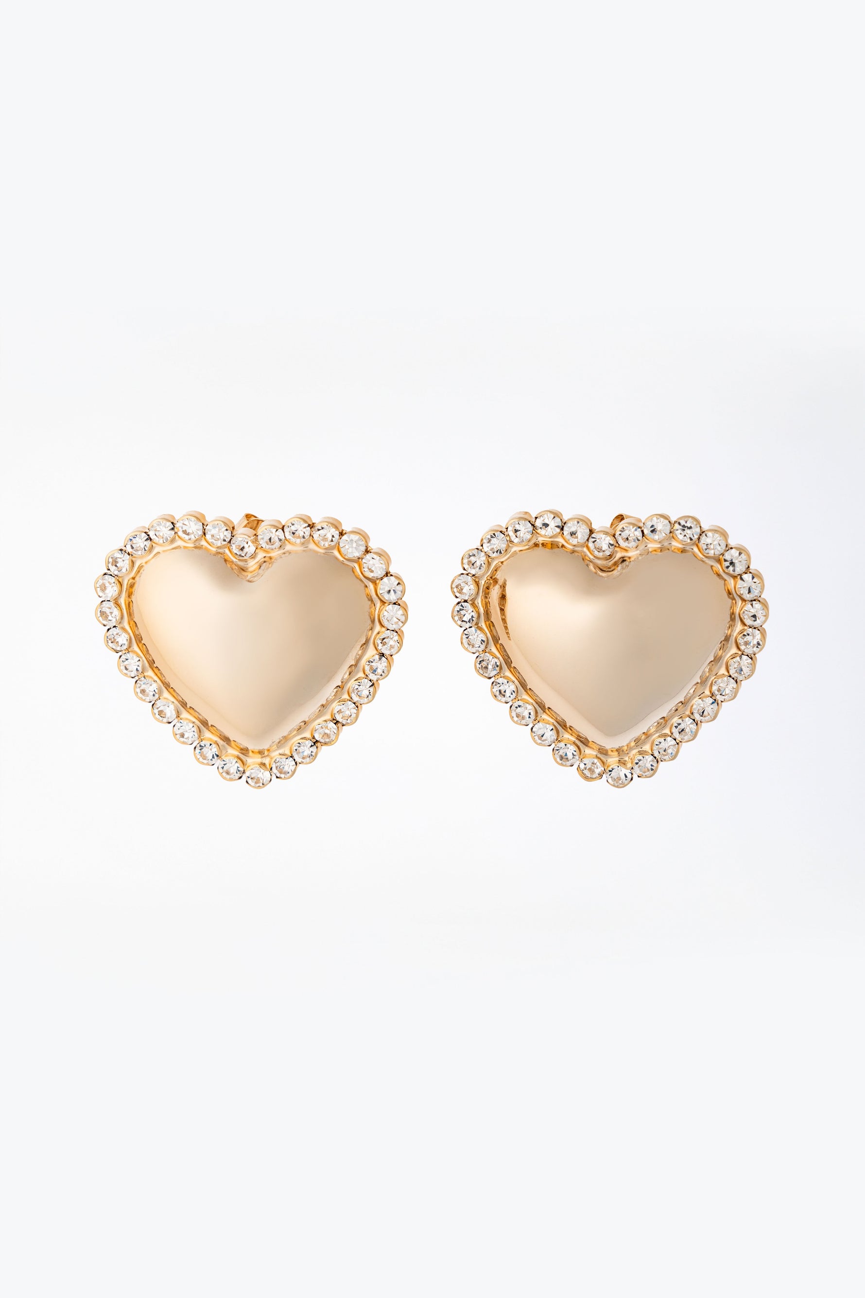 Raffinati e romantici, questi orecchini a cuore presentano un design bombato in ottone dorato, incorniciato da una fila di luminosi strass. Un accessorio dal fascino vintage che aggiunge eleganza e brillantezza a qualsiasi look.