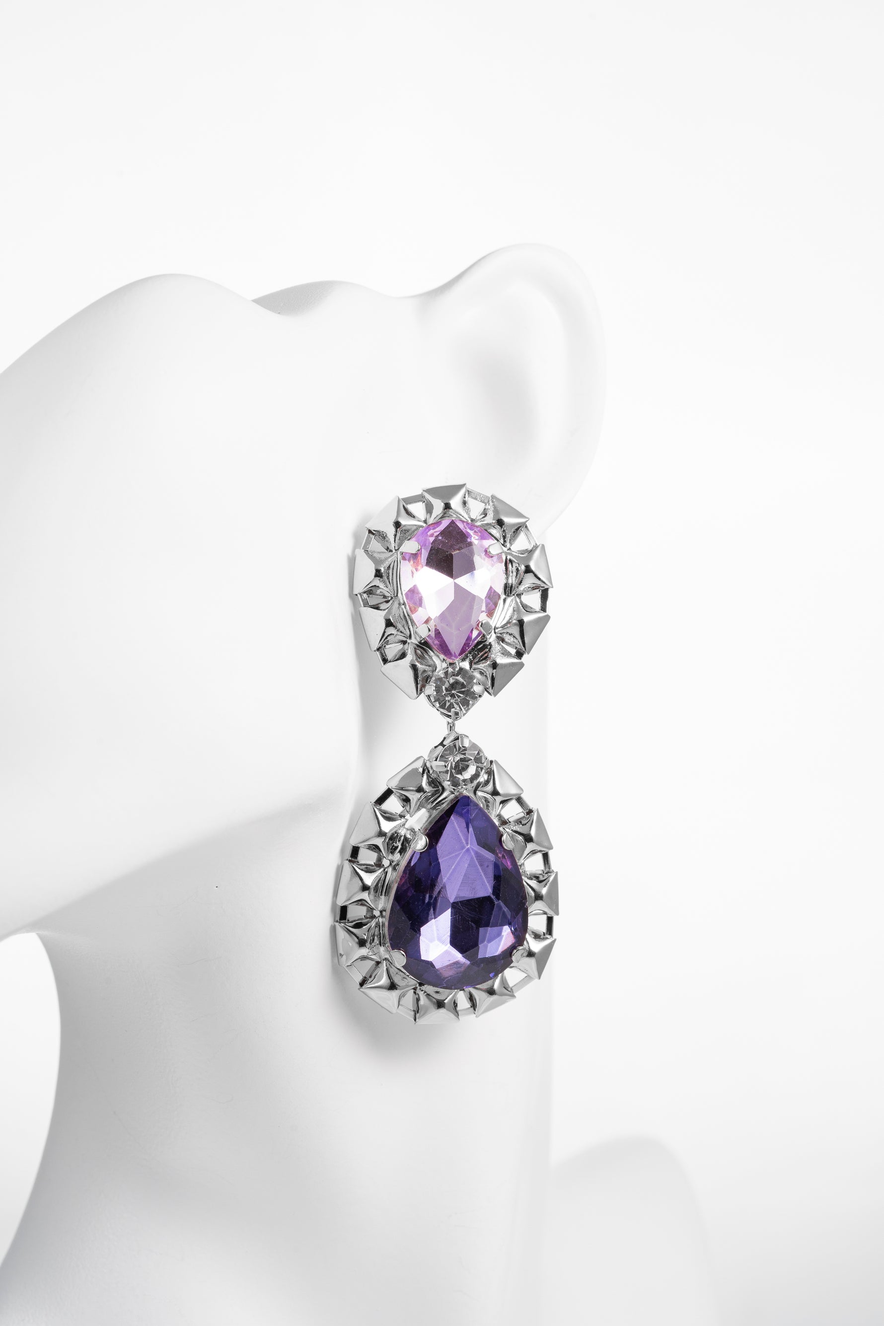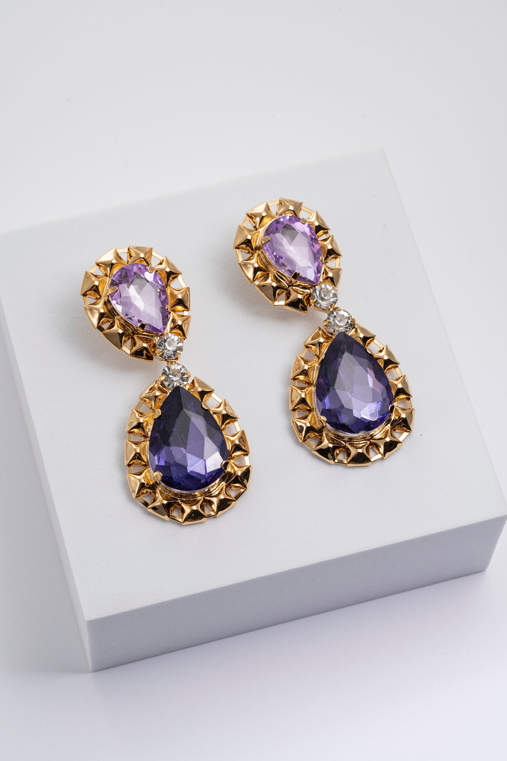 Un inno all’opulenza e alla femminilità. Questi orecchini pendenti combinano due cristalli a goccia in sfumature viola, incorniciati da una struttura dorata scolpita, ricca di dettagli e luce. Il punto luce centrale aggiunge brillantezza, rendendoli perfetti per le grandi occasioni.