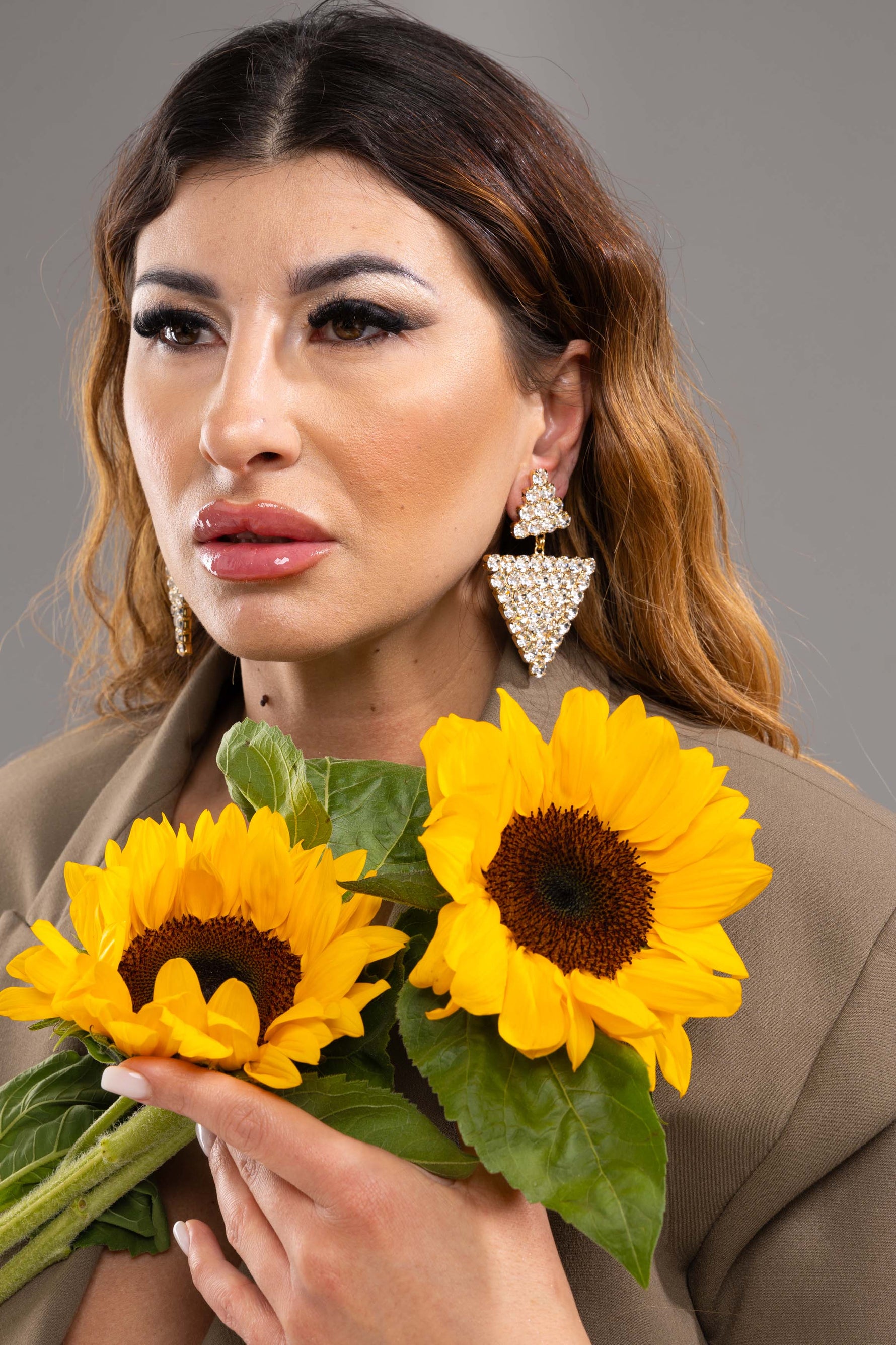 Gli orecchini "Triangolo di Cristallo" combinano un design geometrico moderno con la brillantezza dei cristalli. La forma a triangolo è arricchita da cristalli luminosi disposti in modo da creare un effetto dinamico, che riflette la luce ad ogni movimento. La base dorata aggiunge un tocco di eleganza, rendendo questi orecchini perfetti per chi cerca un accessorio raffinato e contemporaneo. Ideali per matrimoni, serate glamour o eventi eleganti, sono il complemento perfetto per un look sofisticato.