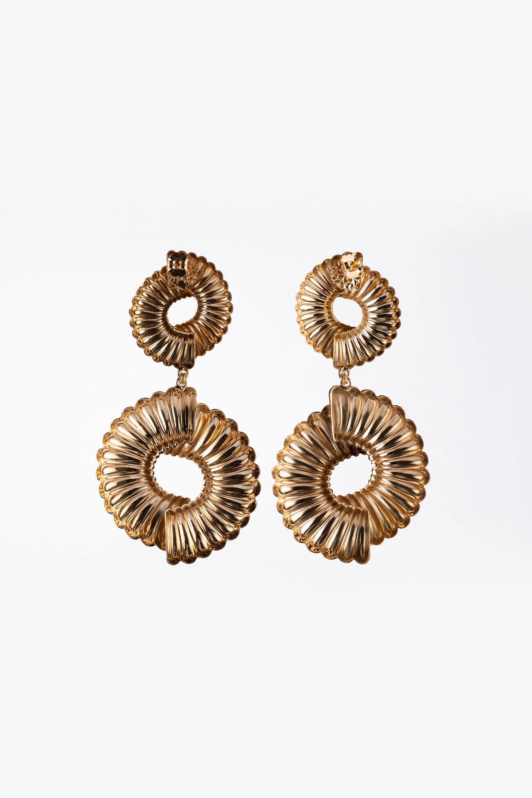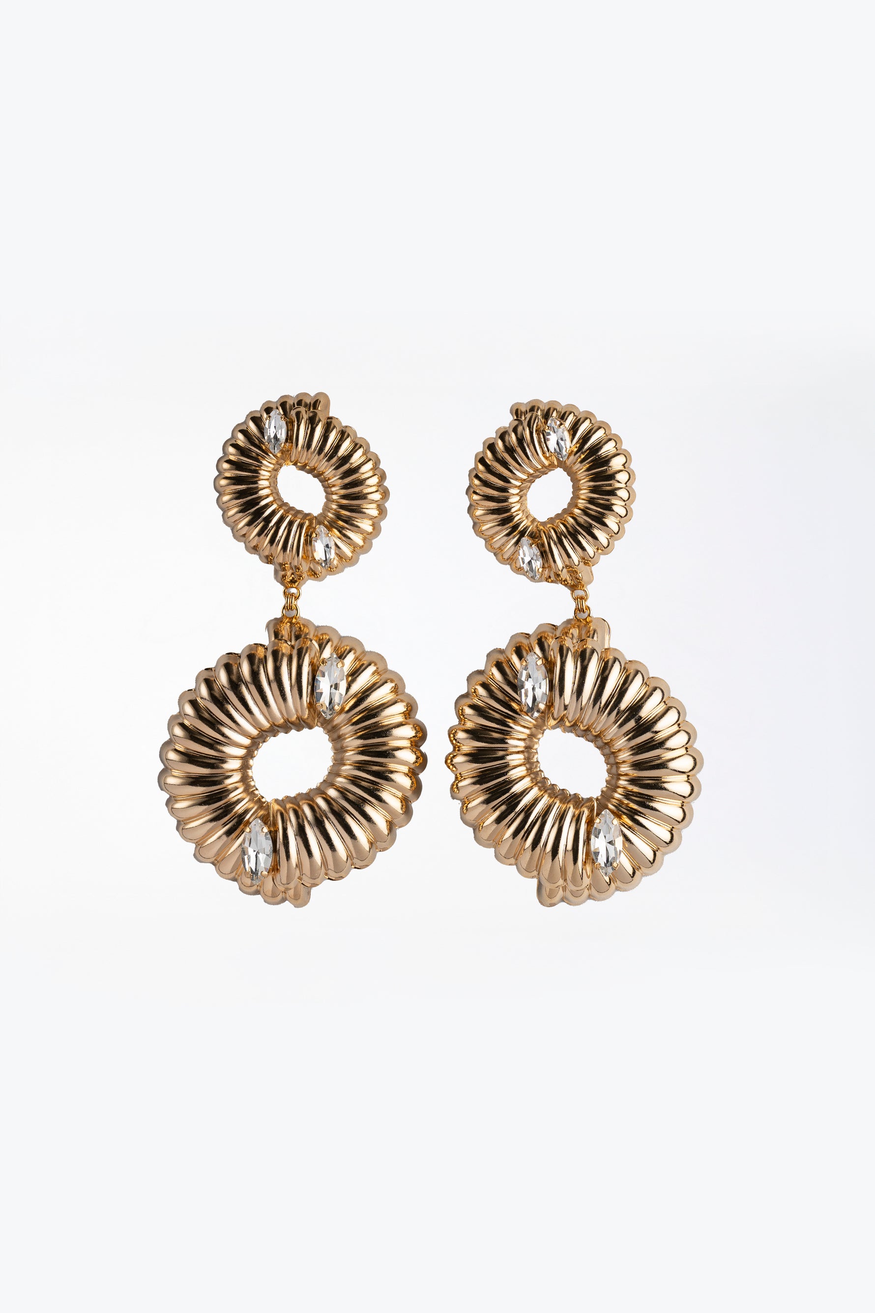 Questi orecchini pendenti in metallo lavorato combinano eleganza e artigianalità, valorizzati da pietre finemente incastonate che richiamano l'effetto "brivido d'onda". Il design sofisticato esalta la luce e dona un tocco distintivo a ogni look, perfetti per chi cerca un accessorio raffinato e di qualità superiore. Ideali per occasioni speciali o per arricchire con stile il proprio outfit quotidiano.